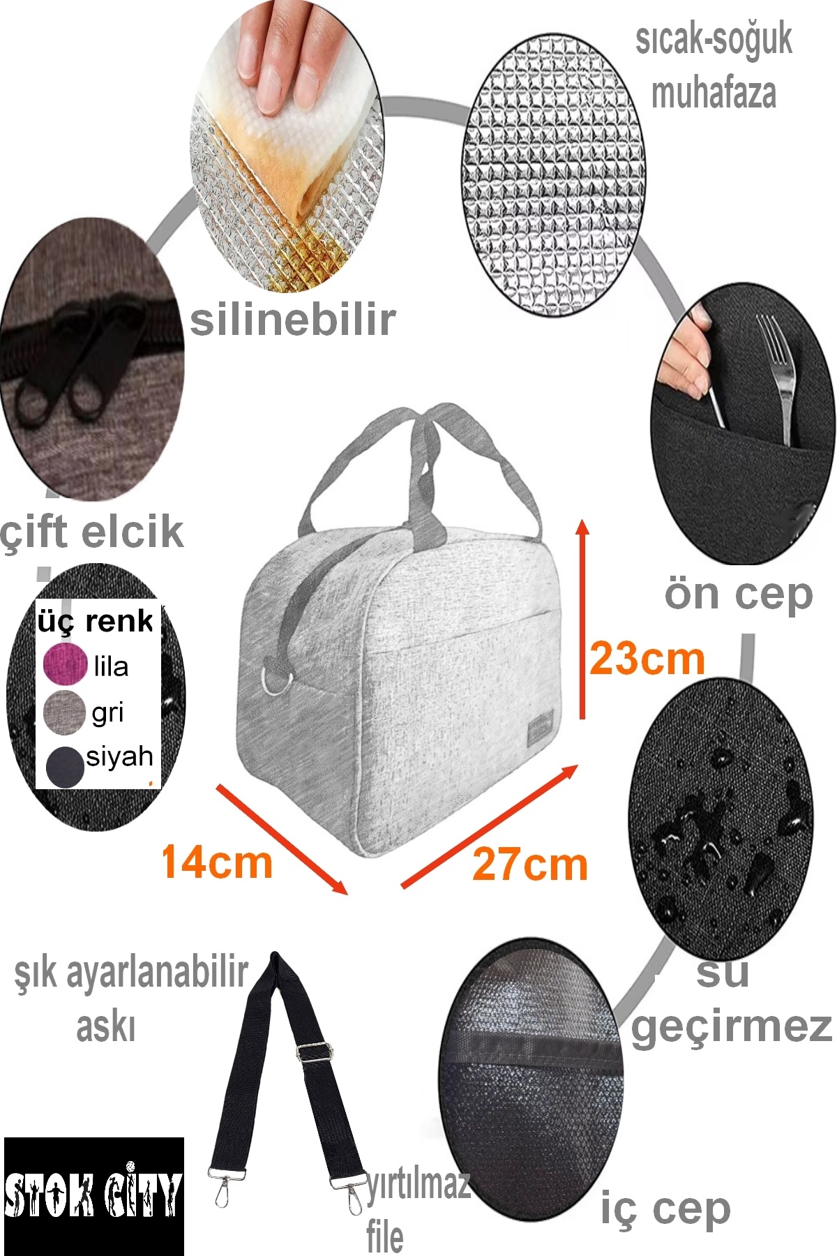 13-23-27 cm ölçülerinde şık canlı renkli metal aksesuarlı - Sürdürülebilirlik detayına sahip bu termal çanta, çevre dostu malzemeler kullanılarak üretilmiştir.