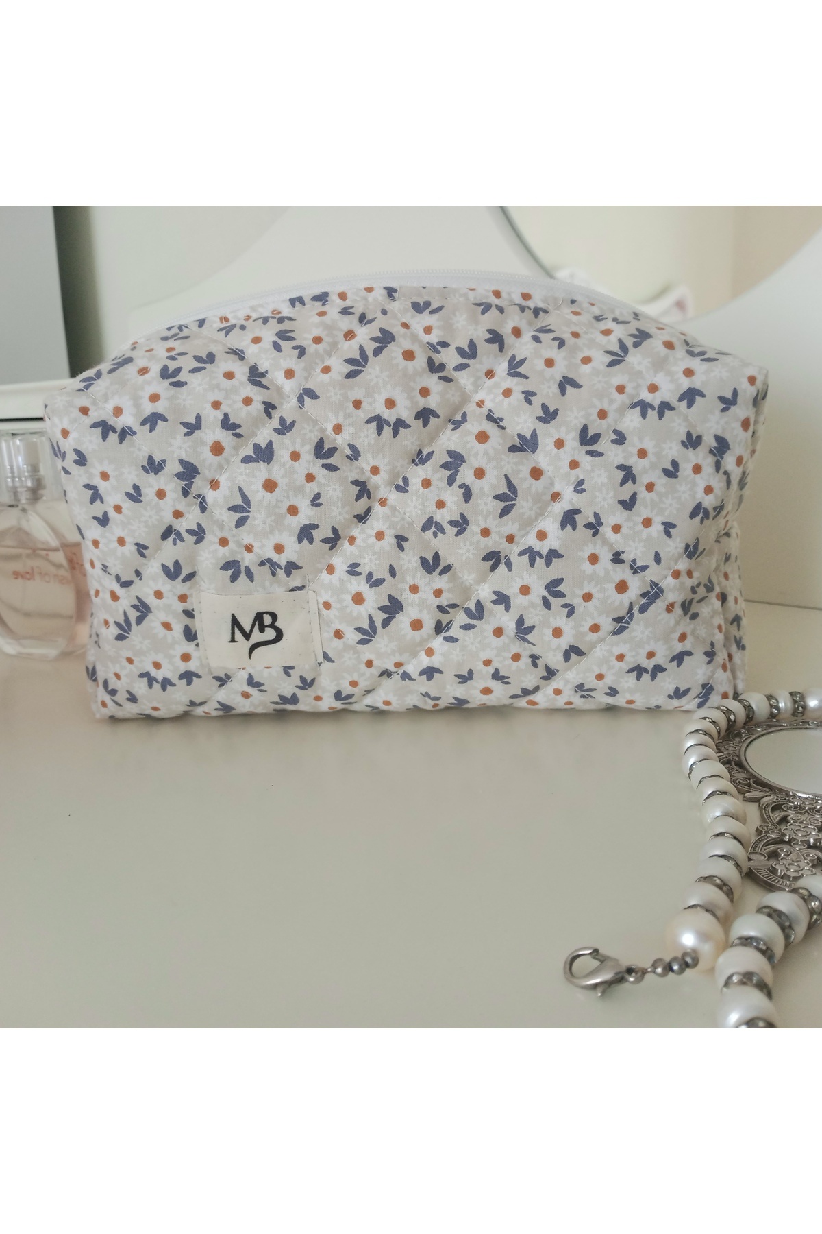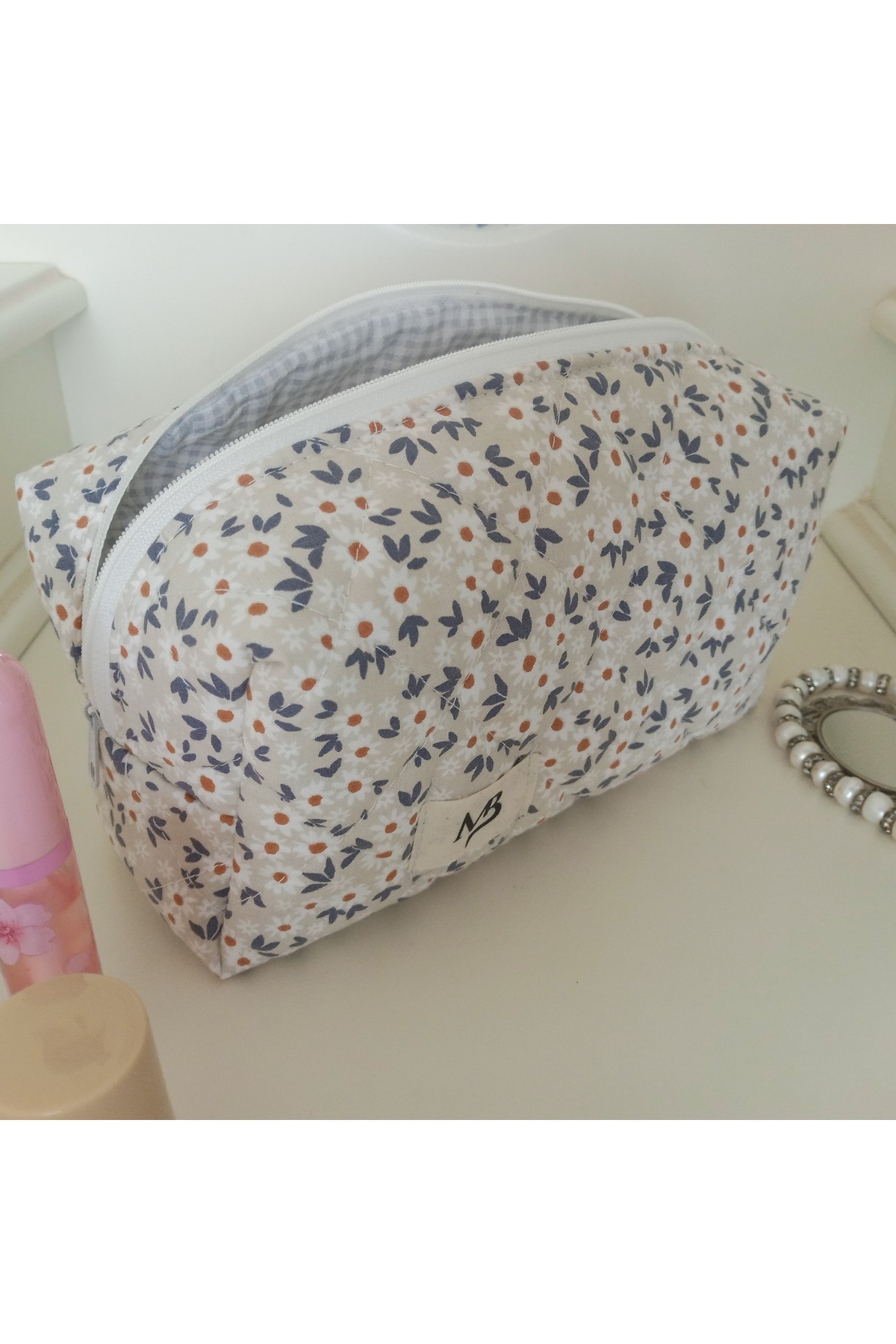 - Krem rengi ve papatya desenleriyle göz alıcı bir görünüm sunan bu makyaj çantası, günlük kullanım için idealdir.
