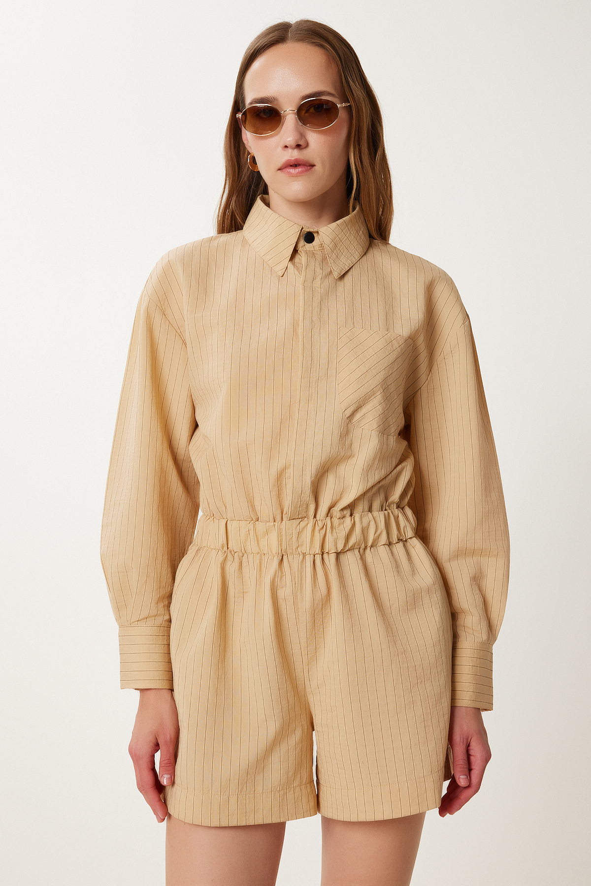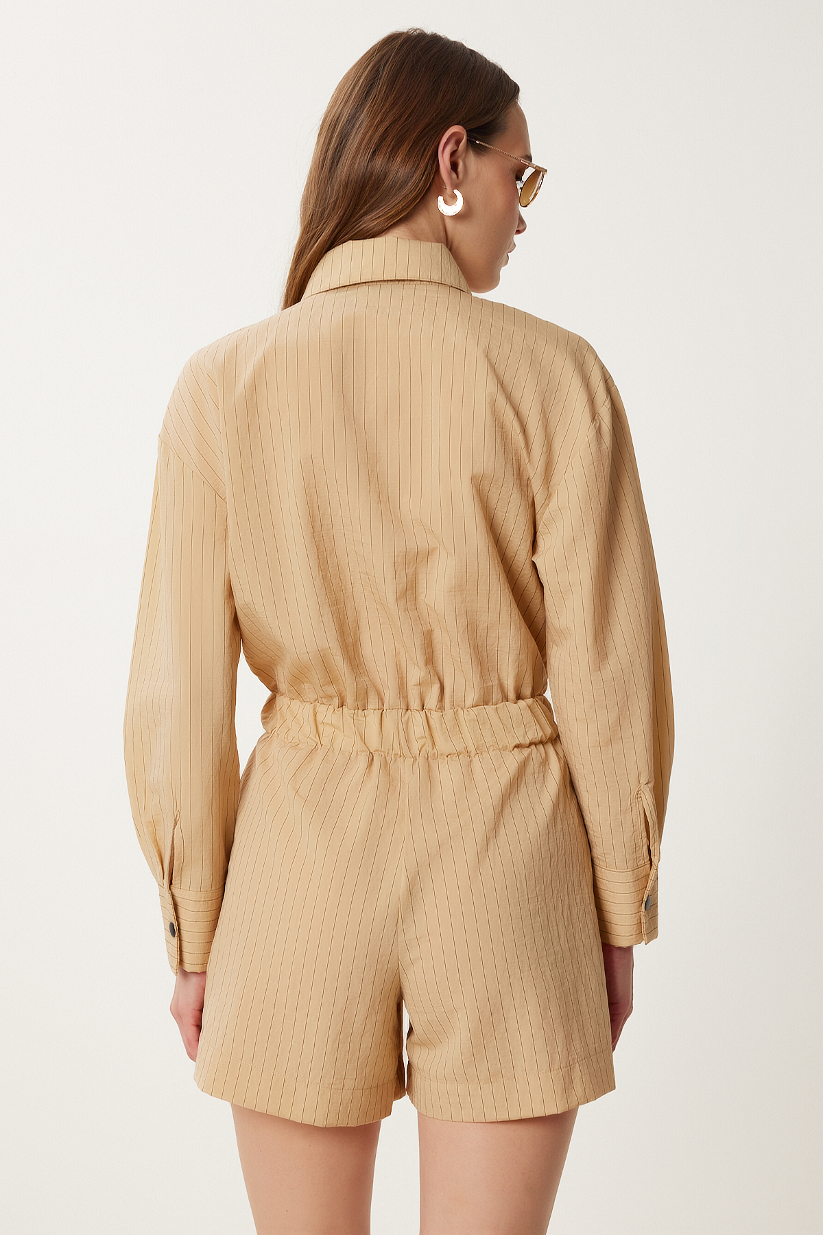 Çıt çıt kapamalı, düşük omuzlu, beli lastikli, ön ve yan cepli, çizgili dokuma mini şort tulum