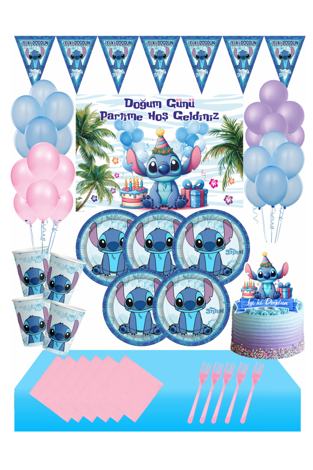 Lilo & Stitch 16 Kişilik Büyük Boy Afişli(70x100cm)Doğum Günü Seti-Pembe-Pasta Süsü
