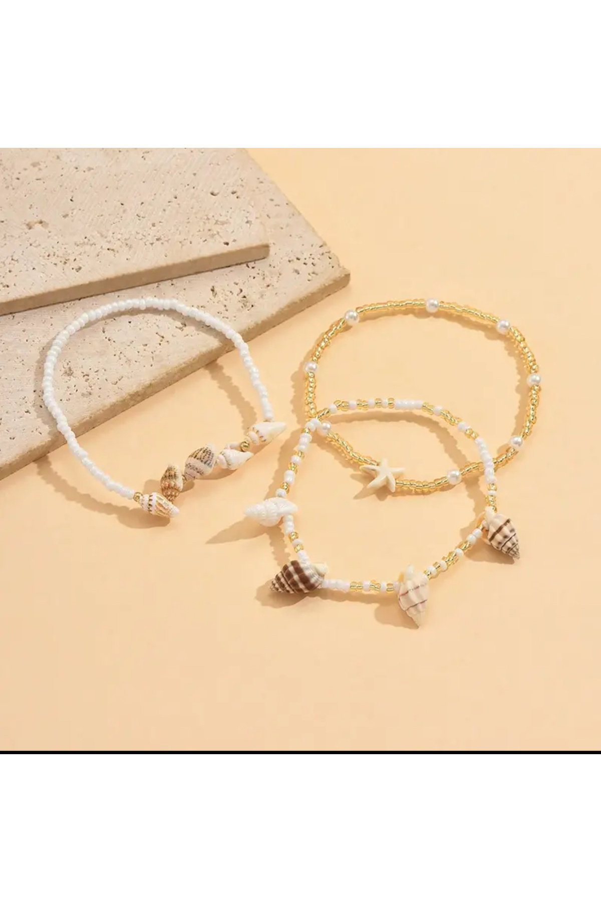 Yazın ruhunu bileklerinizde taşıyın! Deniz kabukları, yıldız ve boncuk detaylarıyla tasarlanmış bu 3’lü ayak bilekliği seti
