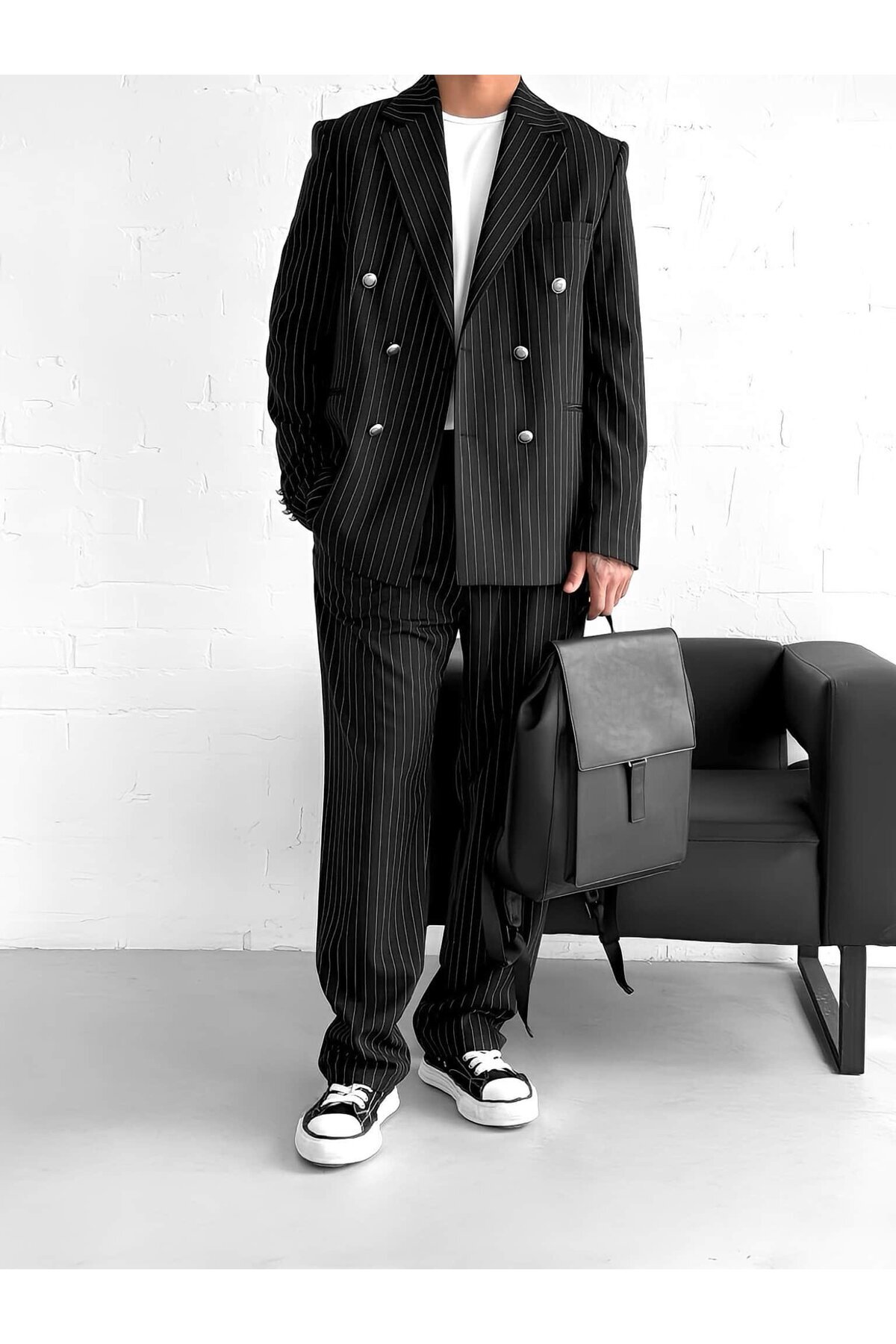 Erkek Çizgili Oversize Kruvaze Takım Elbise Siyah | Abluka Zarafeti