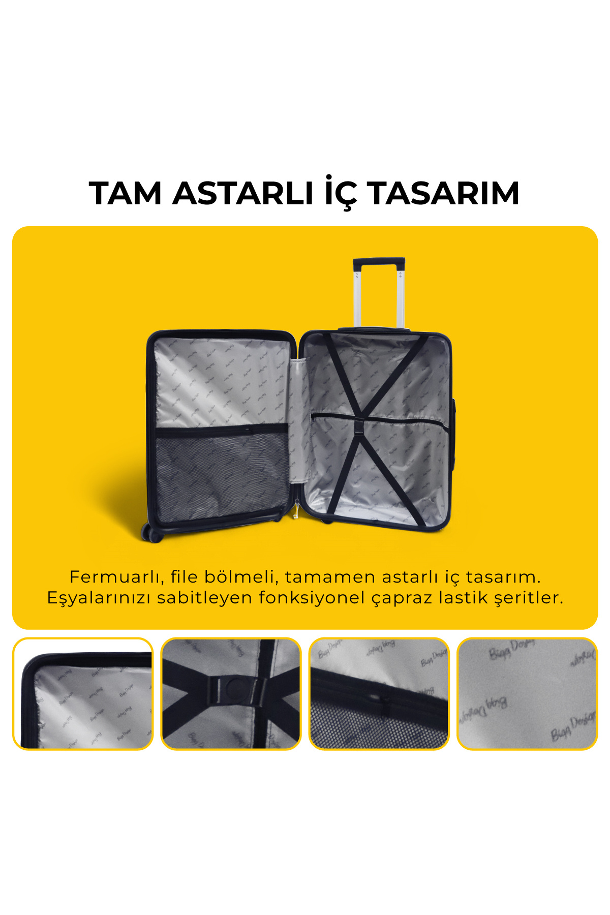 Sık dişli kalın fermuarları, kauçuk-silikon karışımı 360° dönebilen sessiz 4x2 tekerlek sistemi ve rahat kavramalı yumuşak tutma sapı sayesinde hem sessiz hem kolay taşınabilirlik sağlar.