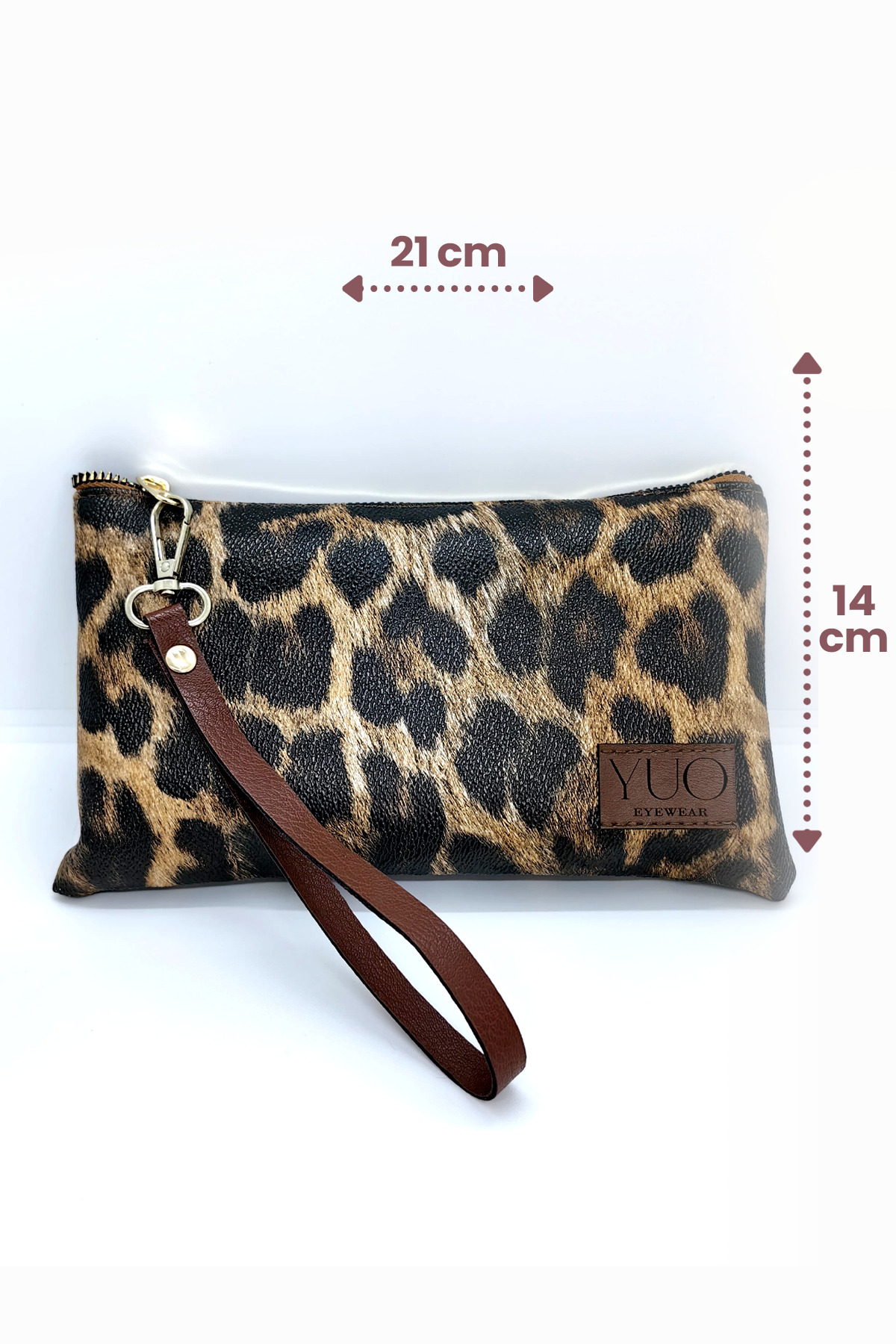 YUO Eyewear Leopar Desenli Deri El Çantası | Kartlık Bölmeli + İç Mini Çantalı | Bileklik Askılı