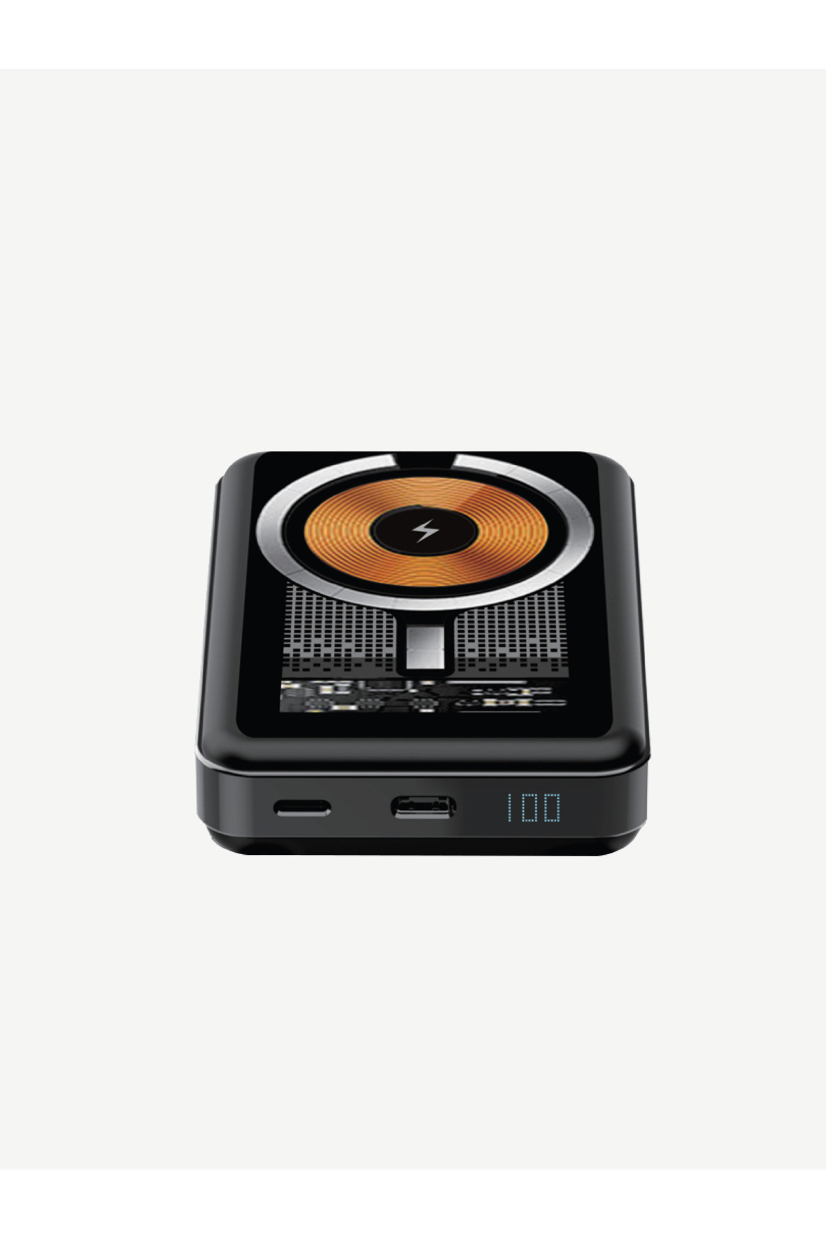 Stabilizasyon için bir destek ayağı ve kalan şarj yüzdesini gösteren dijital bir ekrana sahip olup, kullanıcıya aynı anda iki cihazı şarj edebilen zarif bir kablosuz güç bankası sunar.