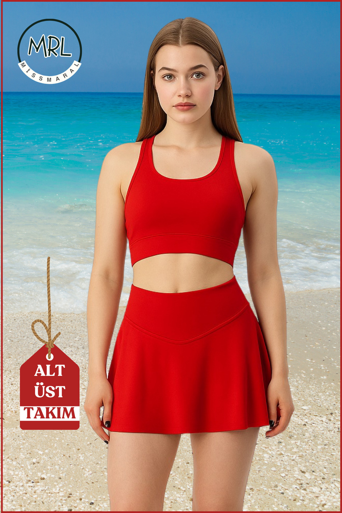 - Canlı kırmızı rengiyle dikkat çeken bu alt-üst takım, plajda ve günlük kullanımda şıklığınızı korumanızı sağlar.