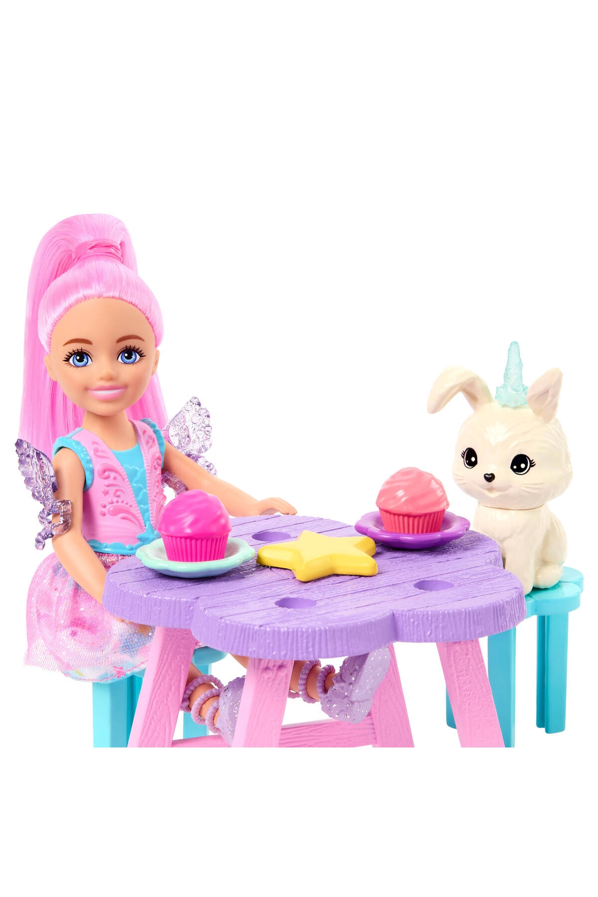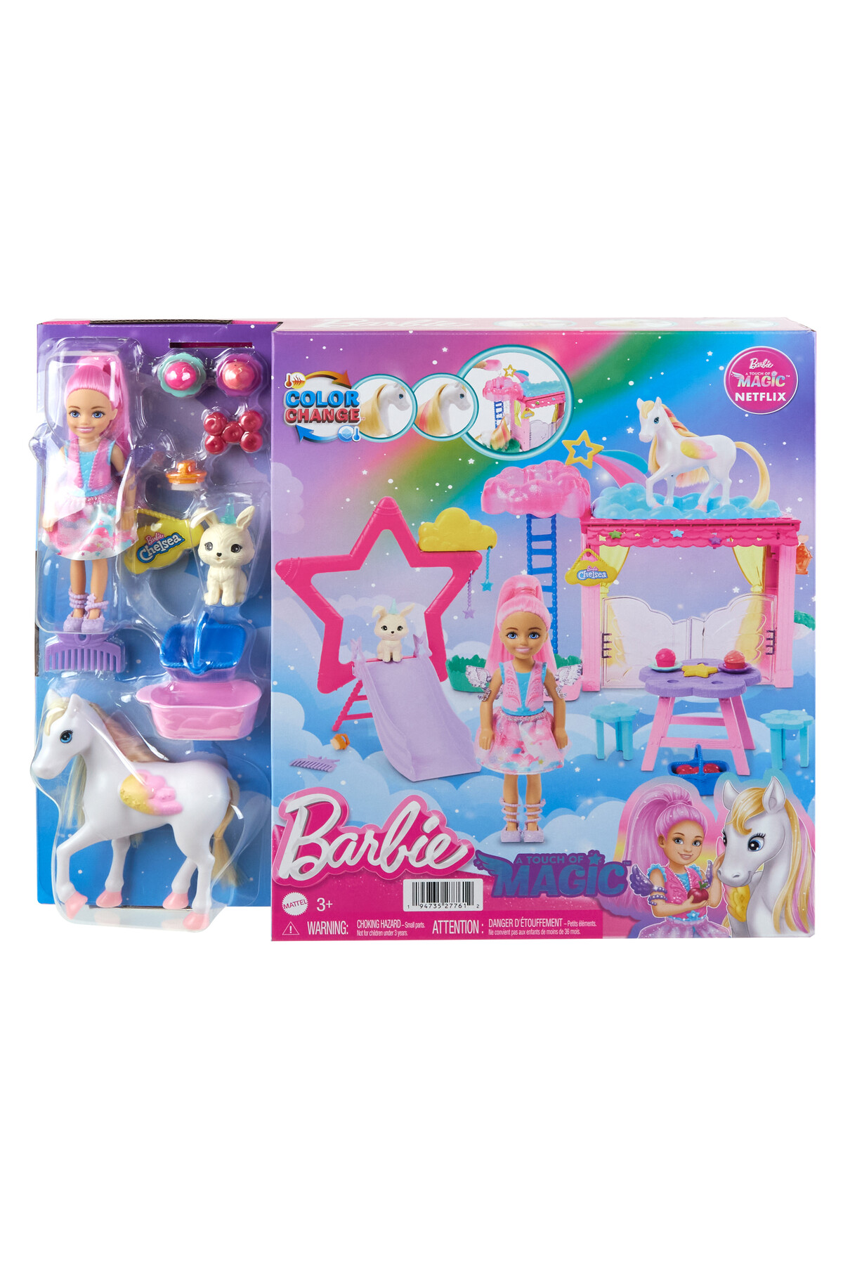 Bu Barbie A Touch of Magic™ oyun setinde bir Chelsea™ bebek ve renk değiştiren yeleli bebek pegasus bulunur. Bu büyülü set, ahır ve kaydırak gibi birden fazla oyun alanının yanı sıra evcil bir tavşan ve renkli aksesuarlar da sunuyor. Çocuklar diziden en sevdikleri sahneleri canlandırabilir veya kendi hikayelerini canlandırabilir. Bebek tek başına ayakta duramaz. Renkler ve süslemeler çeşitlilik gösterebilir.