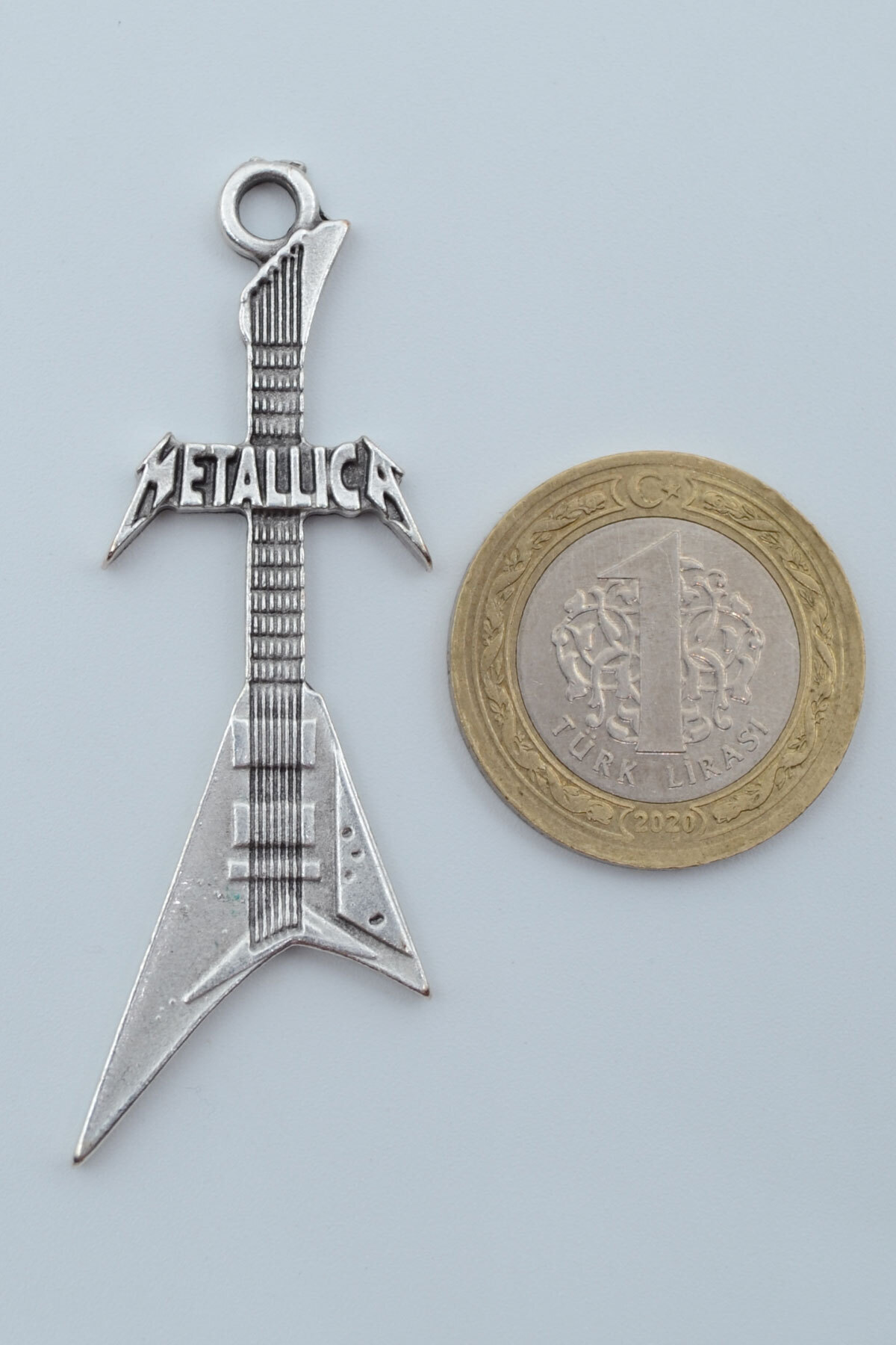 Zamak malzemeden üretilen bu Metallica Elektro Gitar Tasarımı, Antik Gümüş Kaplamasıyla şıklık ve dayanıklılık sunar.2,4 cm x 6,2 cm boyutları ve 6,33 gram ağırlığıyla koleksiyonlar için iadel bir parçadır.