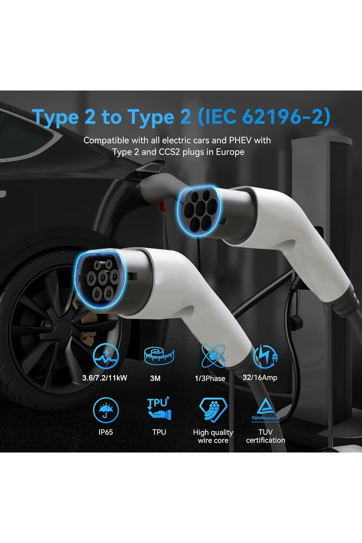 16A/32A 3 Fazlı Elektrikli Araç Şarj Cihazı Kablosu Tip 2 Dişi - Erkek Fiş 3.6kW/7.2kW/11kW 5 Metre