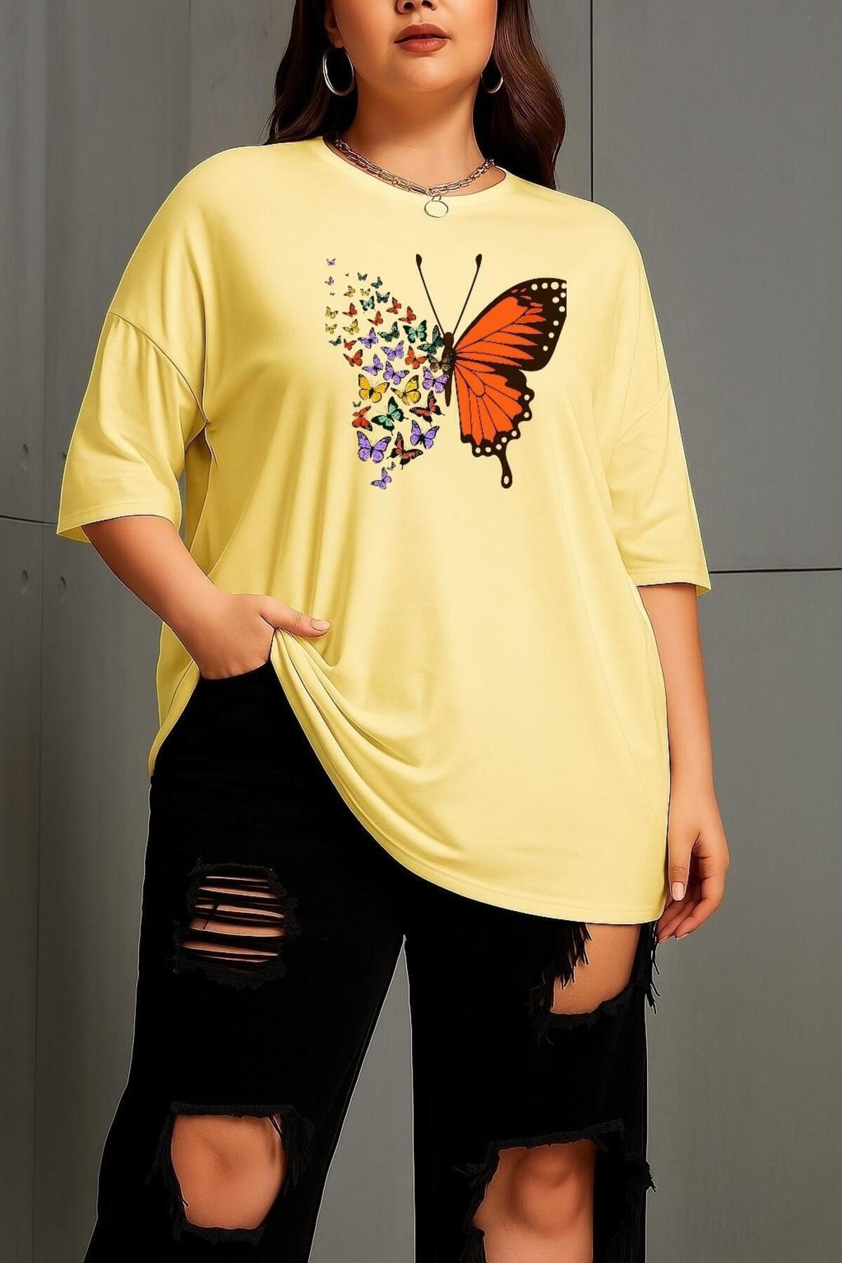 Büyük Beden Kelebek Baskılı Unisex Tişört