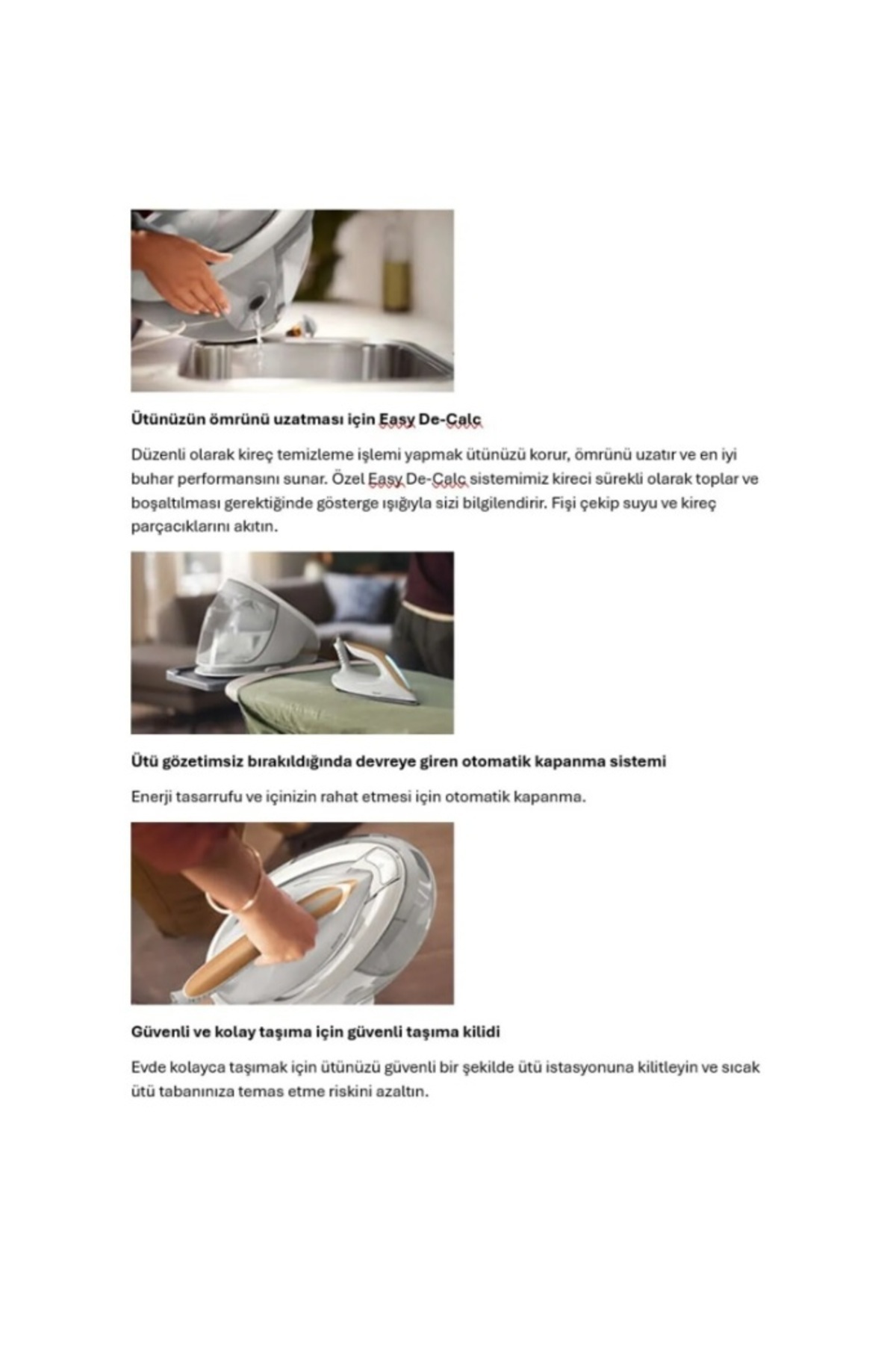 - OptimalTEMP Teknolojisi sayesinde, ütü yaparken yanık riski olmadan mükemmel sonuçlar elde edersiniz.