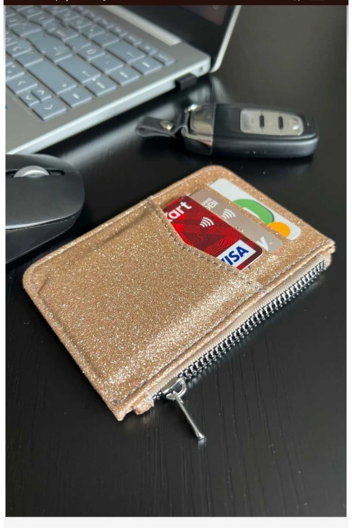 - Şık tasarımıyla dikkat çeken simli gold fermuar detaylı kartlık, günlük kullanımda hem fonksiyonel hem de estetik bir aksesuar sunar.