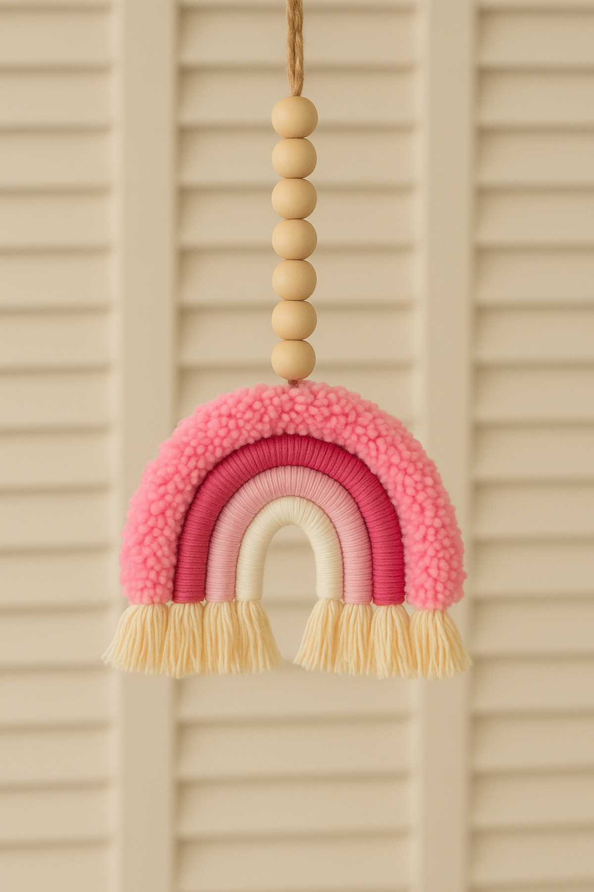 Bebek ve çocuk odalarına huzur ve sıcaklık katan bu özel tasarım makrome gökkuşağı süs, tamamen el yapımı olarak hazırlanmıştır.