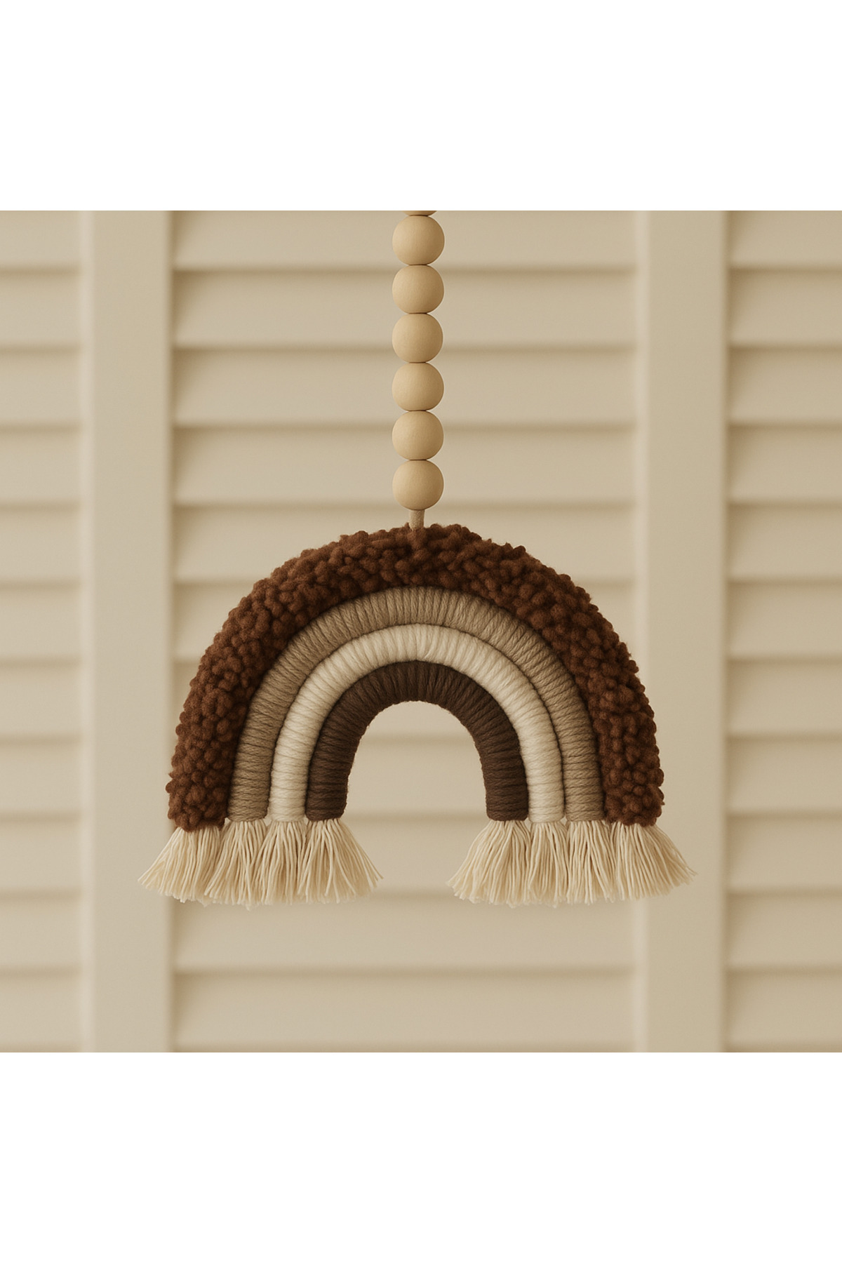 Pastel mavi, gri ve krem tonlarının uyumu ile hazırlanan bu gökkuşağı süs, hem kız hem erkek çocuk odalarıyla rahatlıkla uyum sağlar.