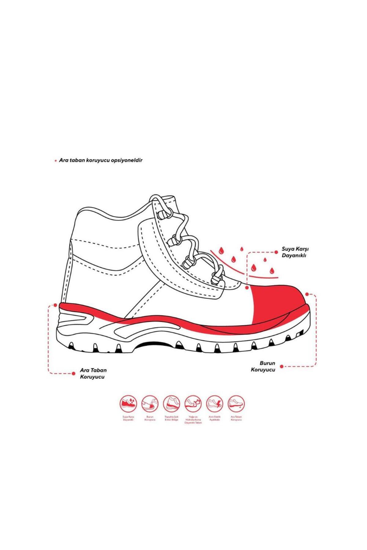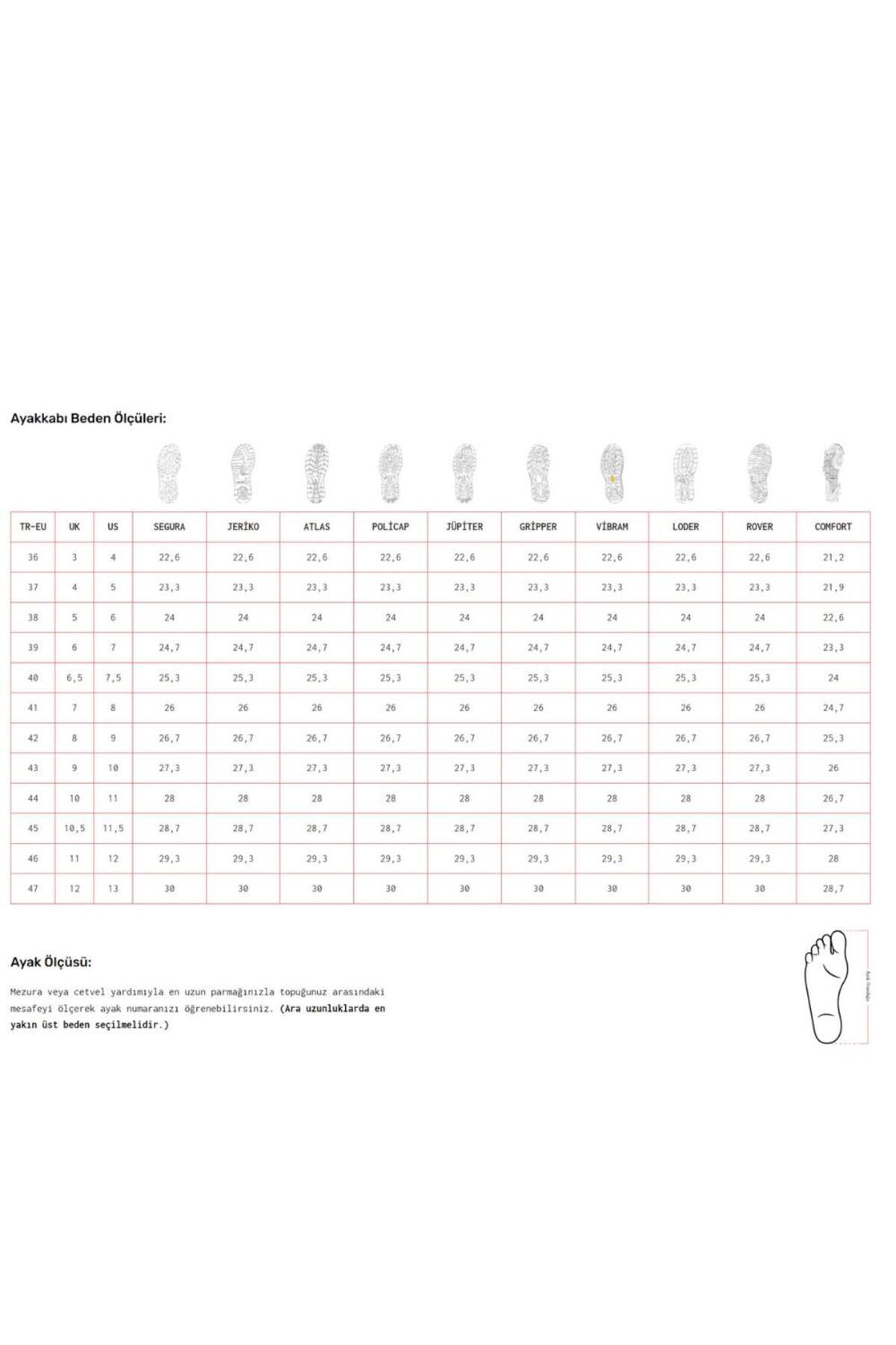 SRC SRC=SRA + SRB Ürün Açıklama Delinmeye dirençli çelik taban Nefes alabilir hakiki deri saya Yağa ve suya dayanıklı saya PU/TPU çift yoğunluklu enjeksiyon taban Antistatik Şok absorbsiyon SRC taban kayma direnci Çelik burun koruma (200j,15kn) Anatomik nefes alabilir iç tabanlık S3 – Aşağıdaki özelliklere sahip kapalı topuk bölgesi: E – Topuk enerjisi emilimi A – Antistatik ayakkabı FO – Dış tabanın akaryakıt direnci P – Delinme dirençli taban Kayma Direnci: SRC=SRA + SRBSRA:Deterjanlı seramik yüzeyde kaymazlıkSRB:Gliserinli metal yüzeyde kaymazlık Çelik Ara Taban Çelik Burun Vidala Deri Tekstil İç Alan Ürün Detay Tablosu