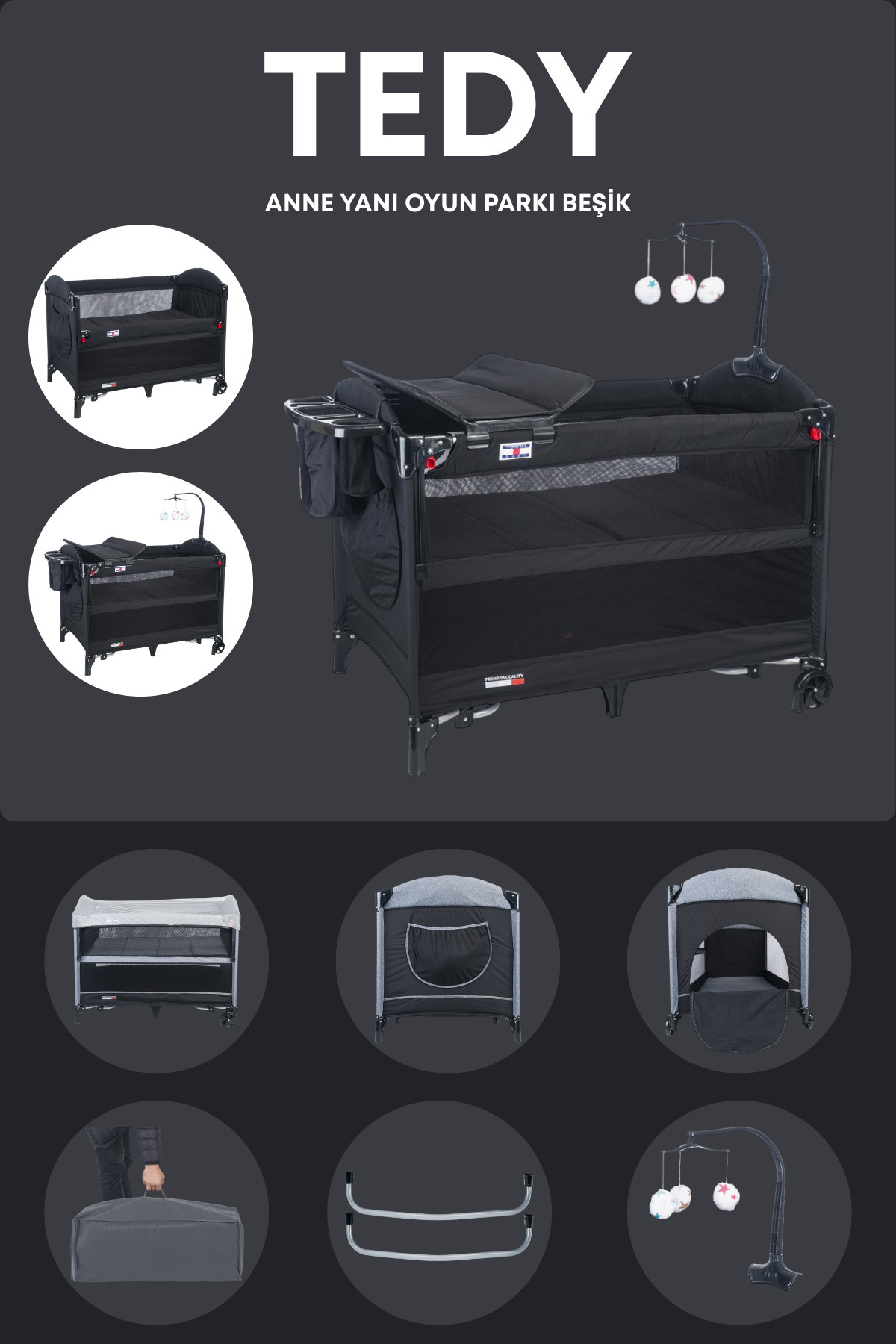 TommyBaby TEDY Anne Yanı Oyun Parkı Beşik 70x110 • Kısa kenarda bebeğin parka kolaylıkla girip çıkabileceği fermuarlı pencere • Alüminyum gövde • 3 kademeli yan cephe • Farklı yaşlarda kullanım için ilave ara kat • Sallanma aparatı ile beşik olarak kullanılabilme • Tekerlekleri sayesinde kolayca taşınabilme • Alt değiştirme ünitesi • Kullanışlı sineklik • Renk seçenekleri • Oyuncaklı oyun barı • Ara kat 9 kg, alt değiştirme 11 kg • Ara kat takılı değilken ana ünitenin maksimum taşıma kapasitesi 15 kg • Açık halde: 70 x 110 cm • Kapalı halde: 28 x 75 cm