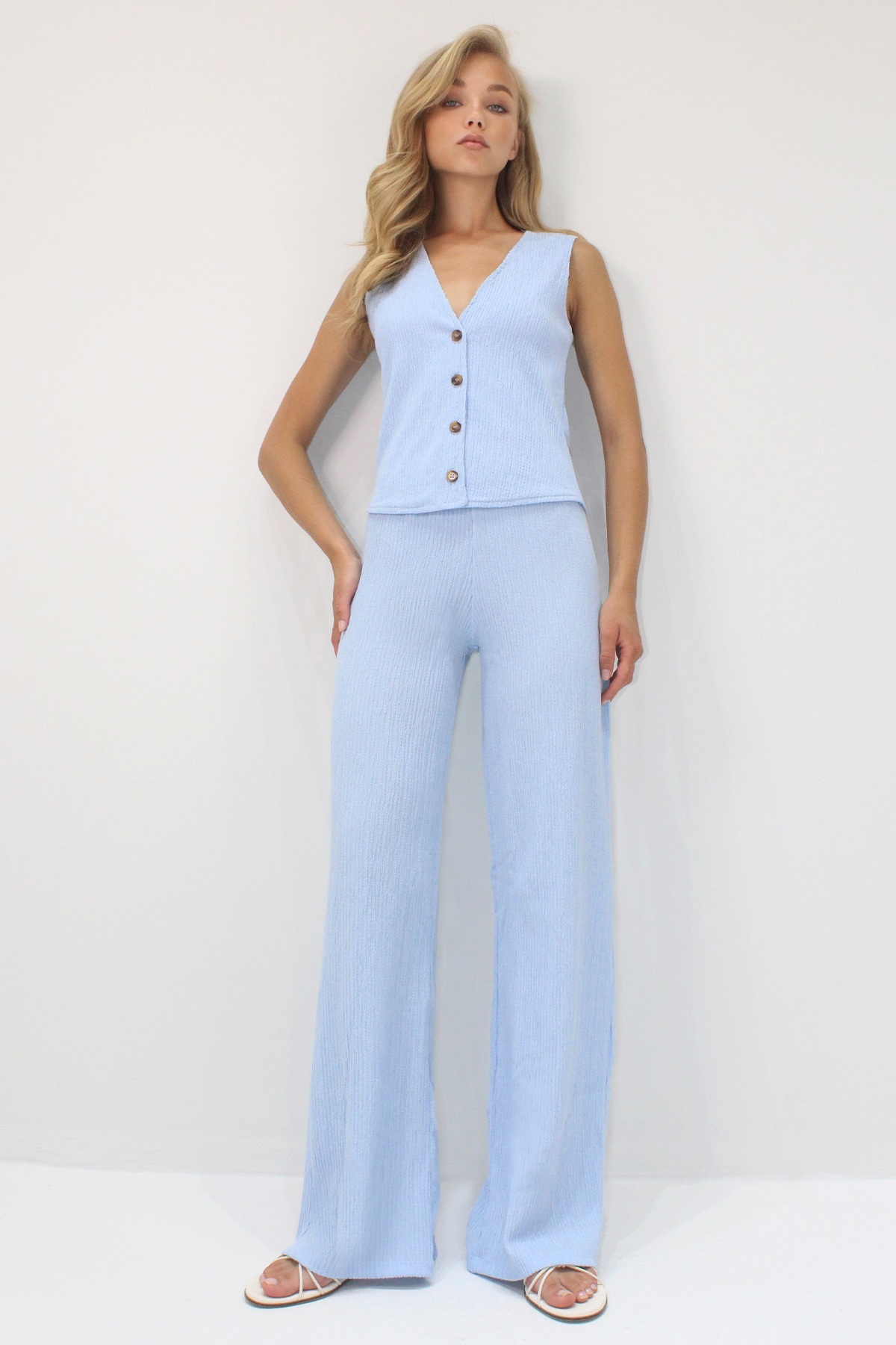 V Yaka Düğmeli Yelek Ve Pantolon Takımı, Şıklığı Ve Modernliği Birleştiren Zarif Bir Kombindir. V Yaka, Yeleğe Şık Bir Dekolte Katarken, Düğme Detayları Geleneksel Bir Dokunuş Ekler Ve Zarif Bir Görünüm Oluşturur. Pantolon, Rahat Bir Kesime Sahip Olup, Takımın Şıklığını Tamamlar. Takım, Ofis Şıklığı İçin Mükemmel Bir Seçenek Olup, Günlük Hayatta Da Şık Bir Görünüm Sağlar. Hem Topuklu Ayakkabılarla Hem De Rahat Ayakkabılarla Kombinlenebilir. Bu Takım, Şıklığı Ve Konforu Bir Arada Arayanlar İçin İdeal Bir Tercihtir.