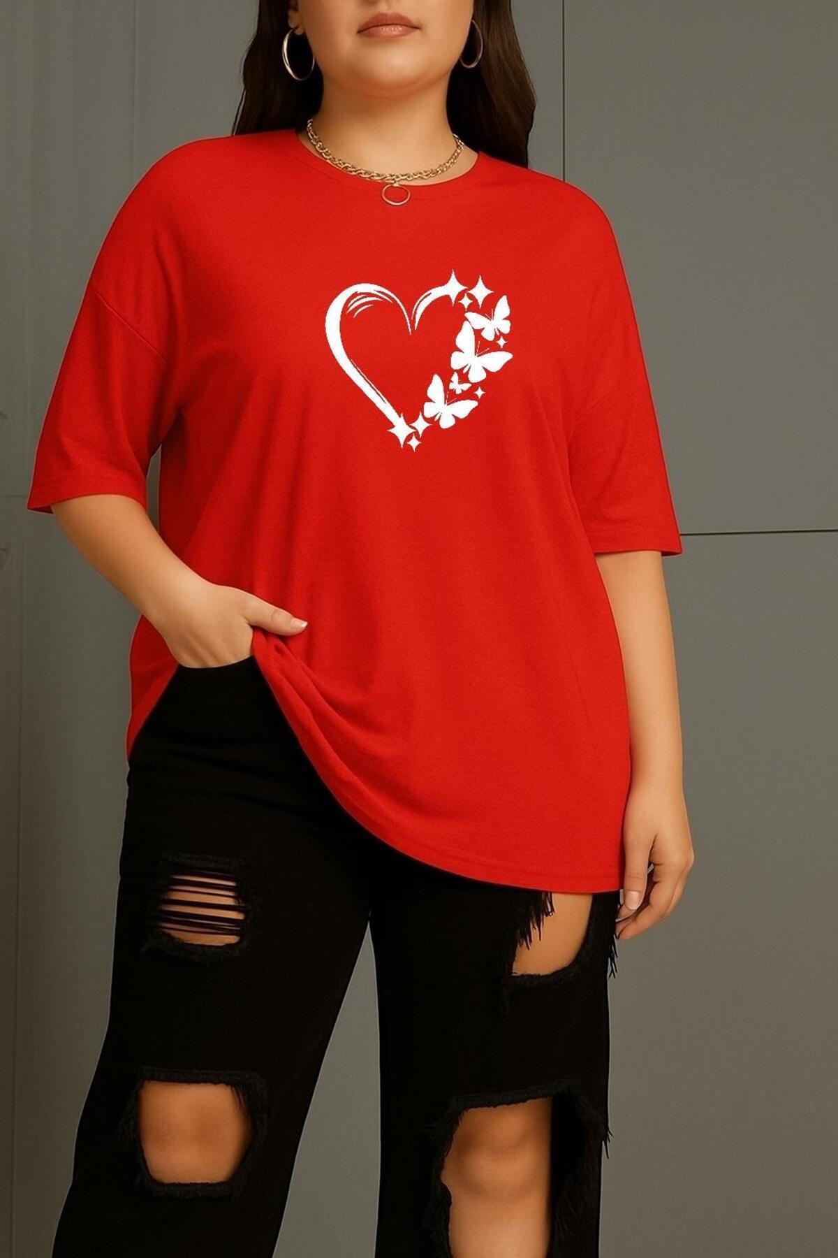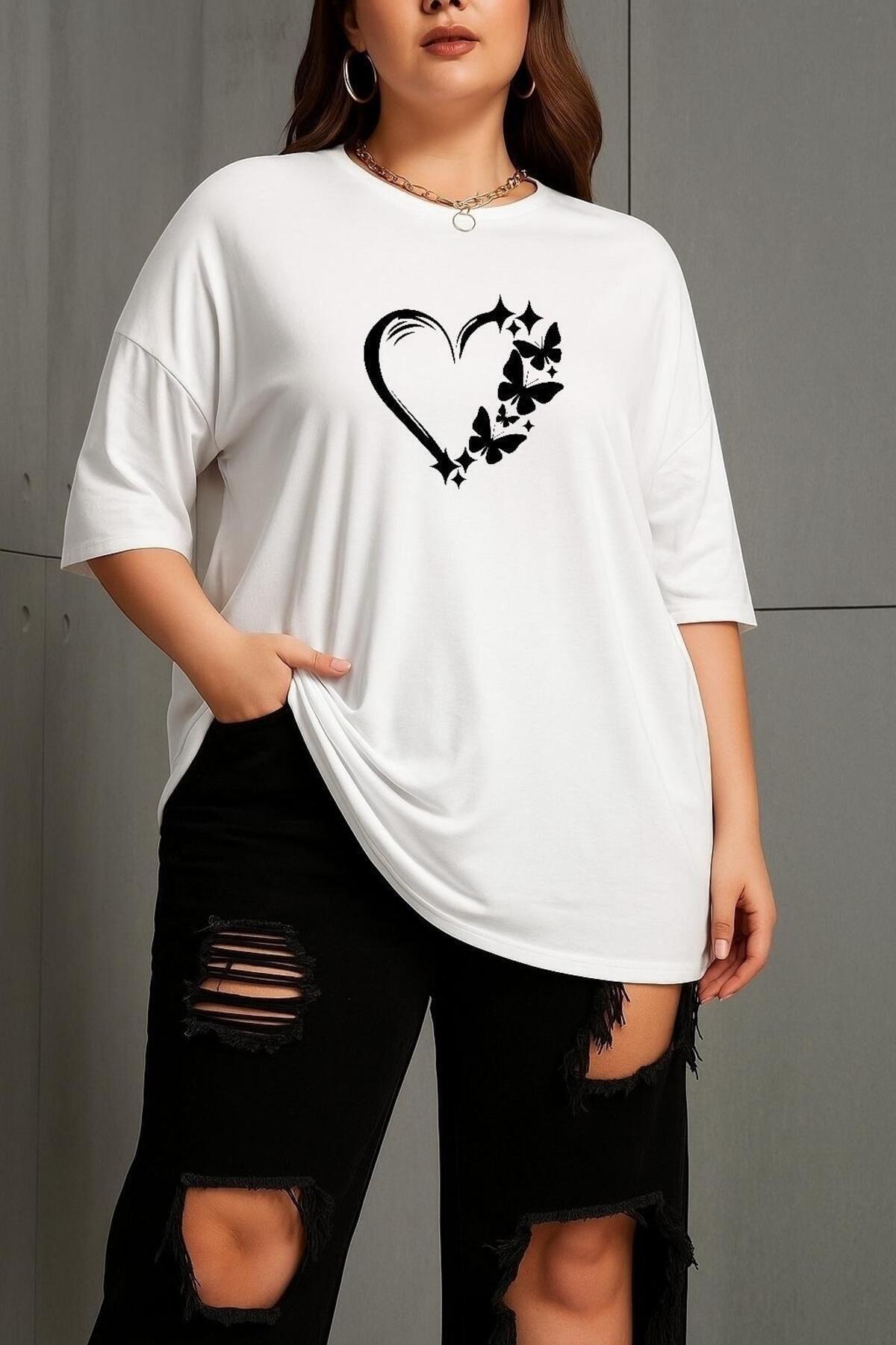 Büyük Beden Kalpli Kelebek Baskılı Unisex Tişört