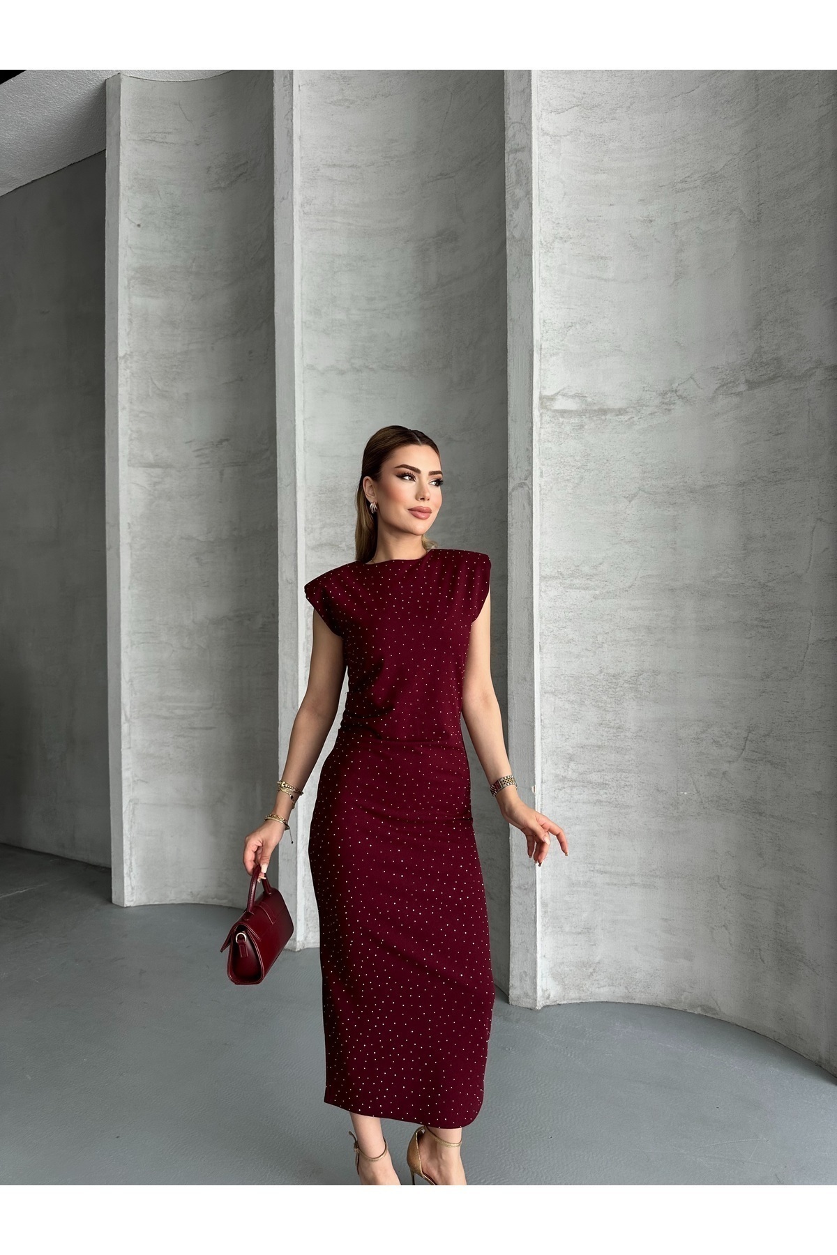 Ürün Özellikleri: •Renk: Bordo •Desen: Taş işlemeli •Kalıp: Vücuda oturan slim fit •Boy: Midi •Yaka: Bisiklet yaka •Kol tipi: Kolsuz •Stil: Şık / Gece / Davet •Kumaş: Kaliteli dokuma kumaş Bakım Talimatı: •Tersten yıkayınız •Elde yıkama önerilir •Düşük ısıda ütülenmelidir.