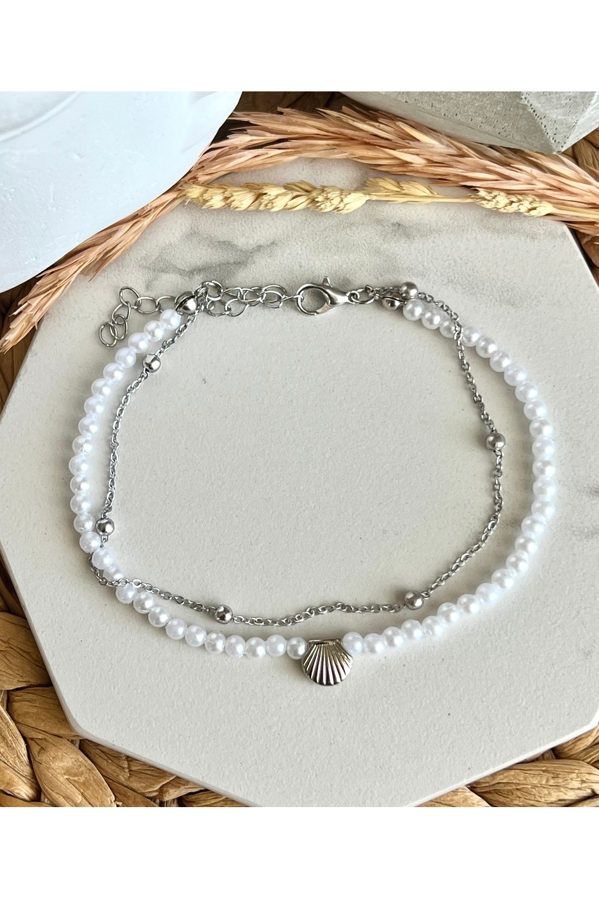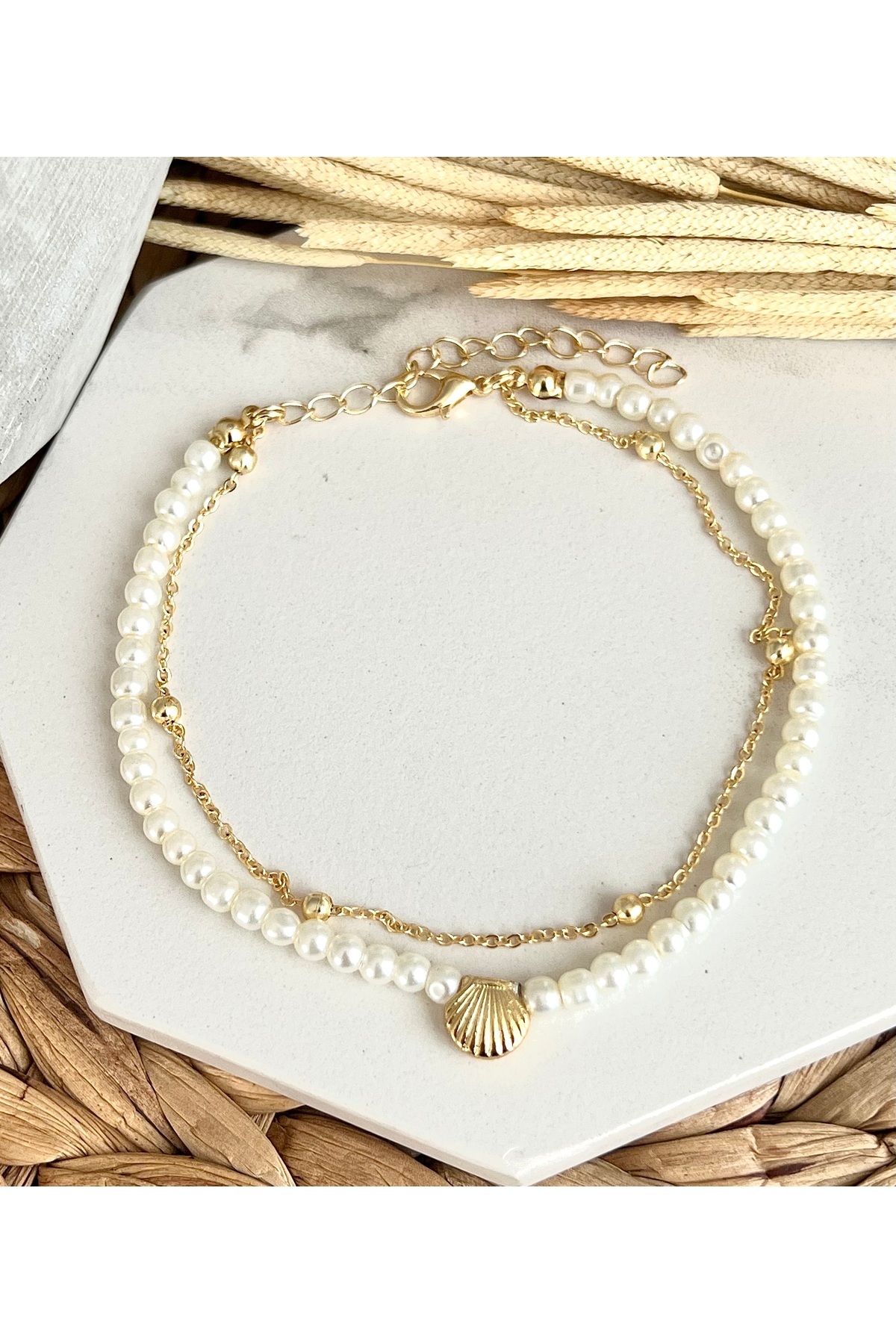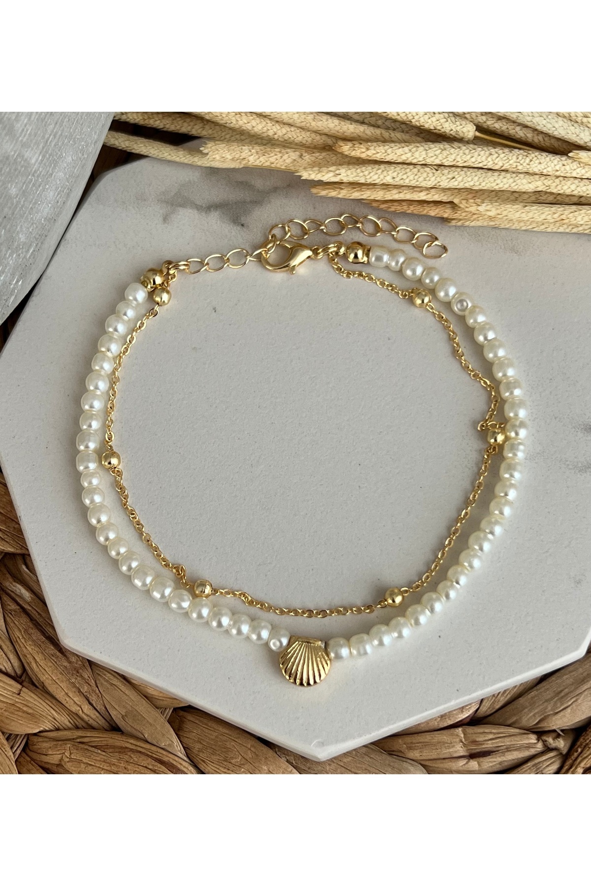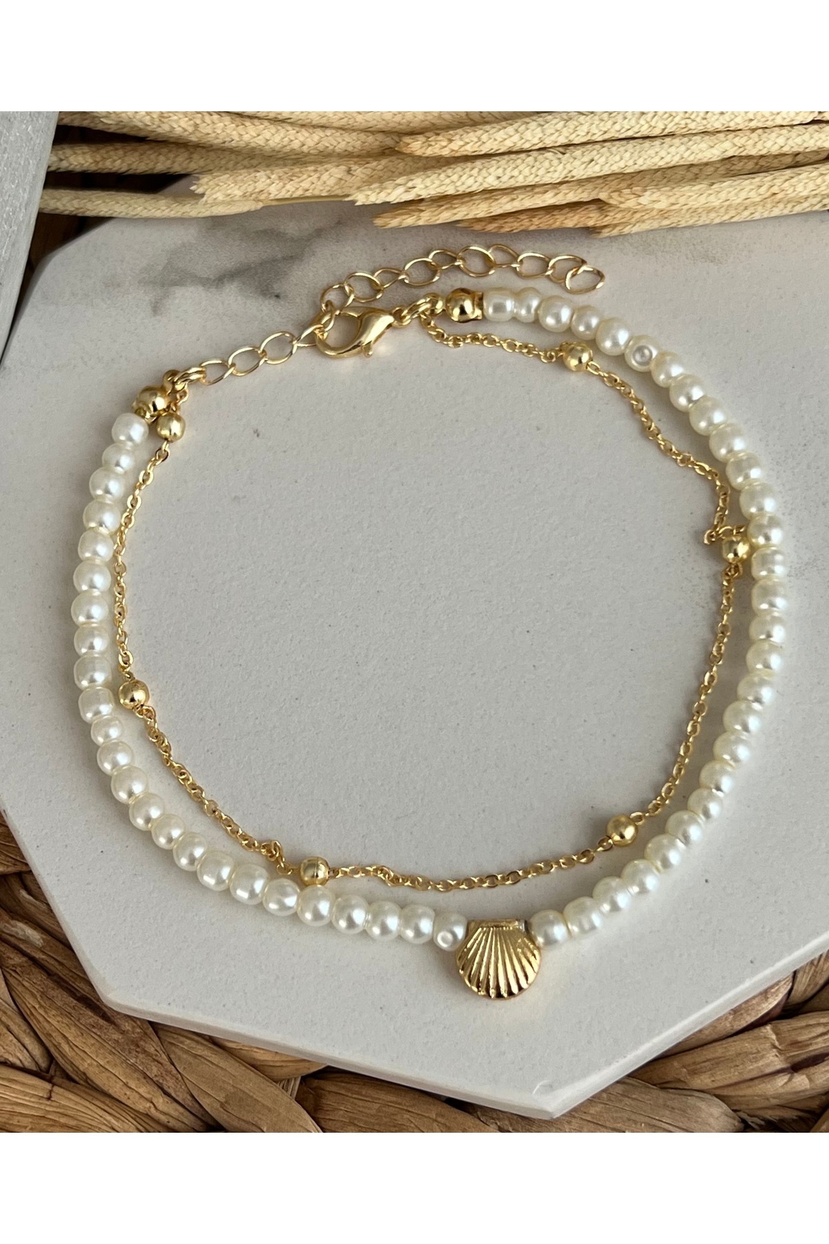 Gold istiridye tasarımlı incili toplu zincirli trend ve şık tasarım halhal