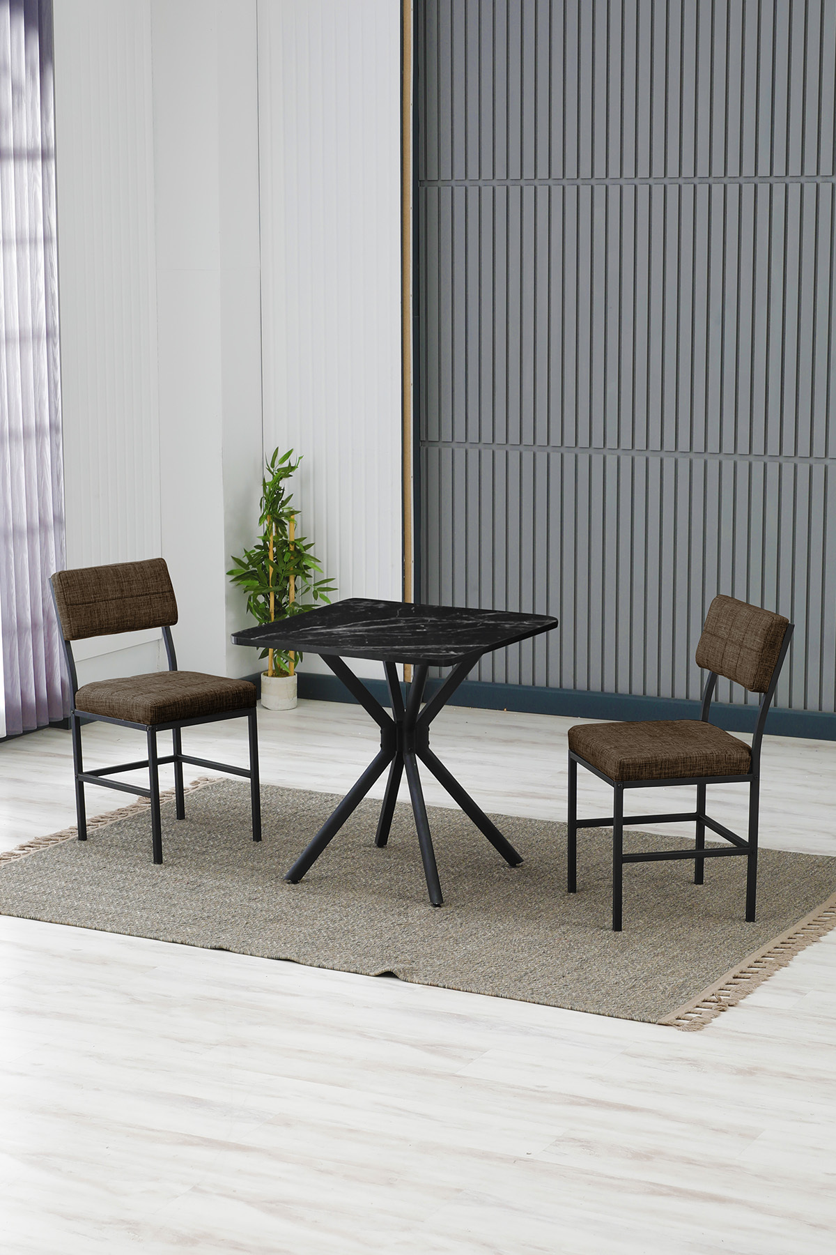 Dubai Modeli Kare Mutfak Masa Sandalye Takımı 2 Sandalye 1 Siyah Mermer Desen Masa 70x70 Keten Kumaş
