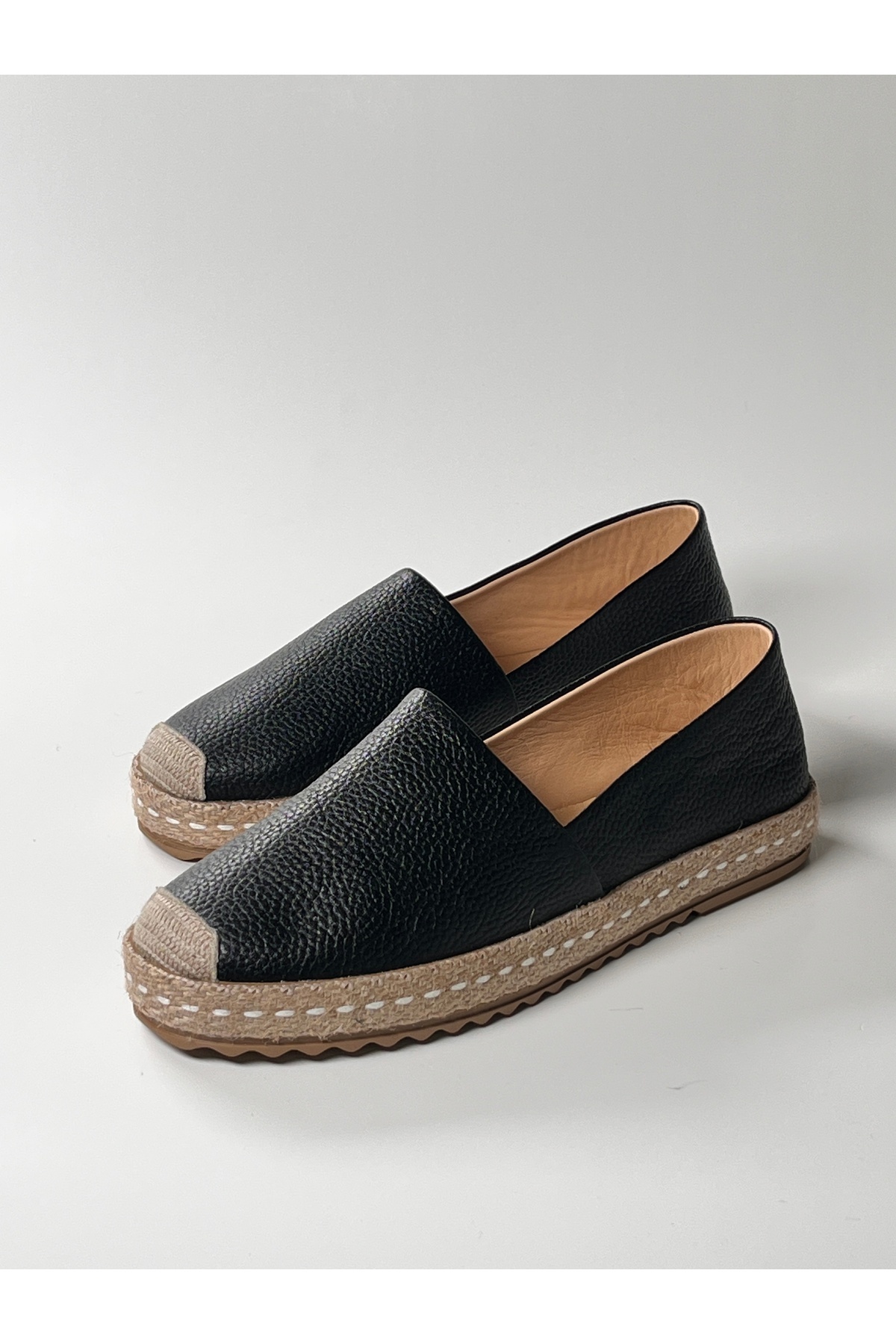 Siyah rengiyle ilk bakışta dikkat çeken bu el yapımı espadril ayakkabı,zarafeti ve konforu bir arada sunuyor,