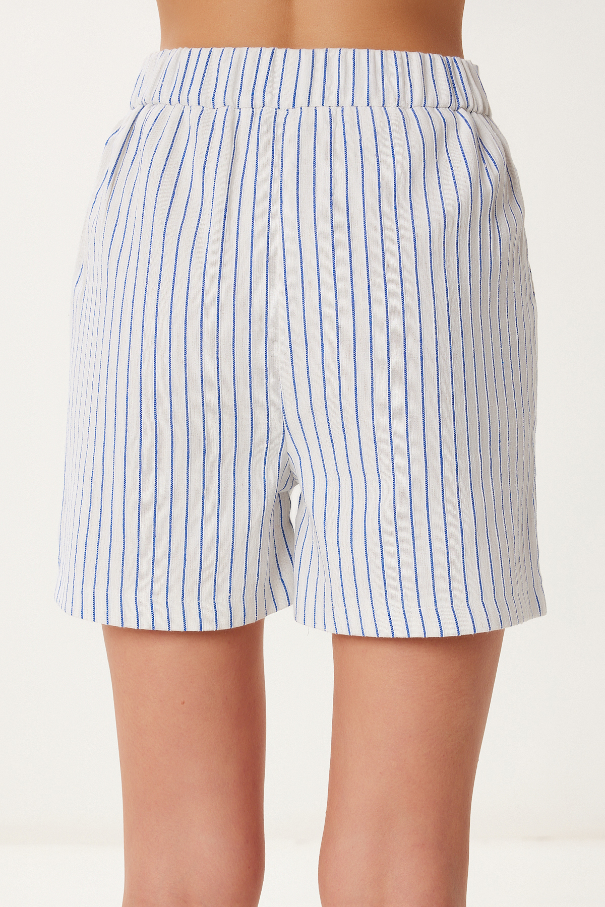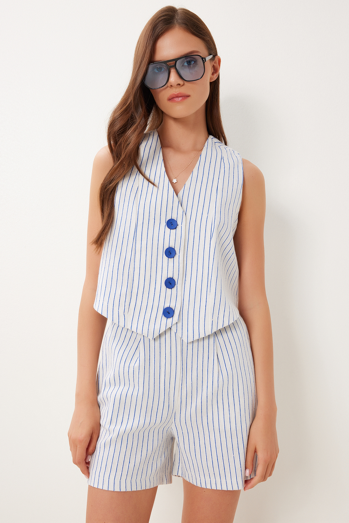 V yaka, düğme kapamalı yelek ve düğme-fermuar kapamalı, yan cepli şorttan oluşan çizgili keten takım