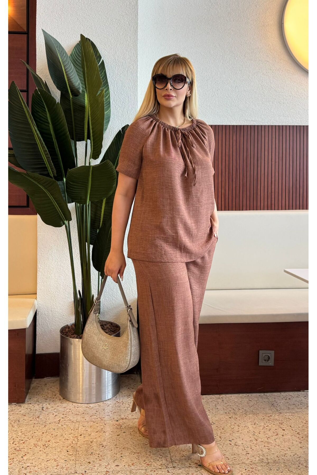 KADIN BÜYÜK BEDEN MADONNA YAKA BLUZ BEL LASTİKLİ CEPLİ SALAŞ ALT SOFIA KETEN KUMAŞ EŞOFMAN TAKIM