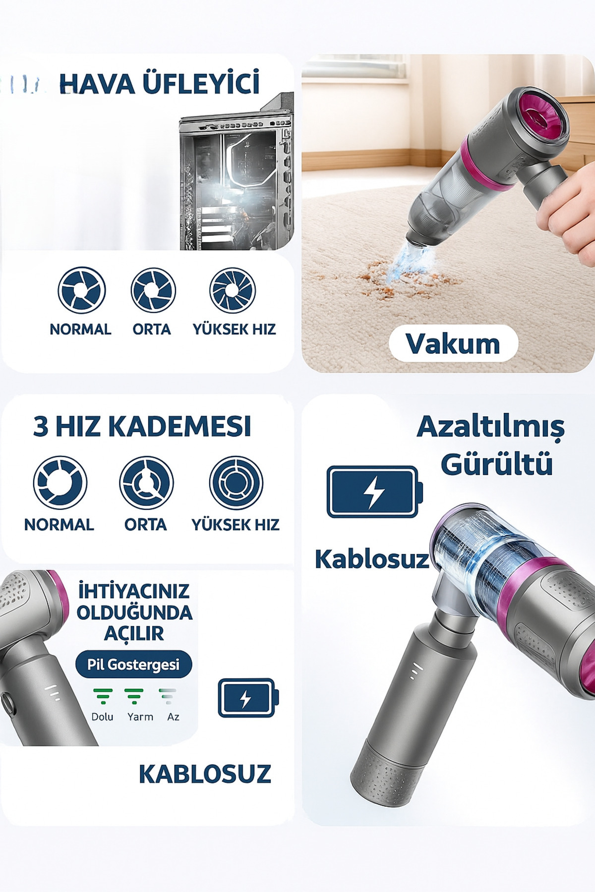 Kablosuz Taşınabilir Araç İçi El Süpürgesi | 15000PA Vakum Gücü | 8 Başlık + Çanta Hediyeli AUHMA