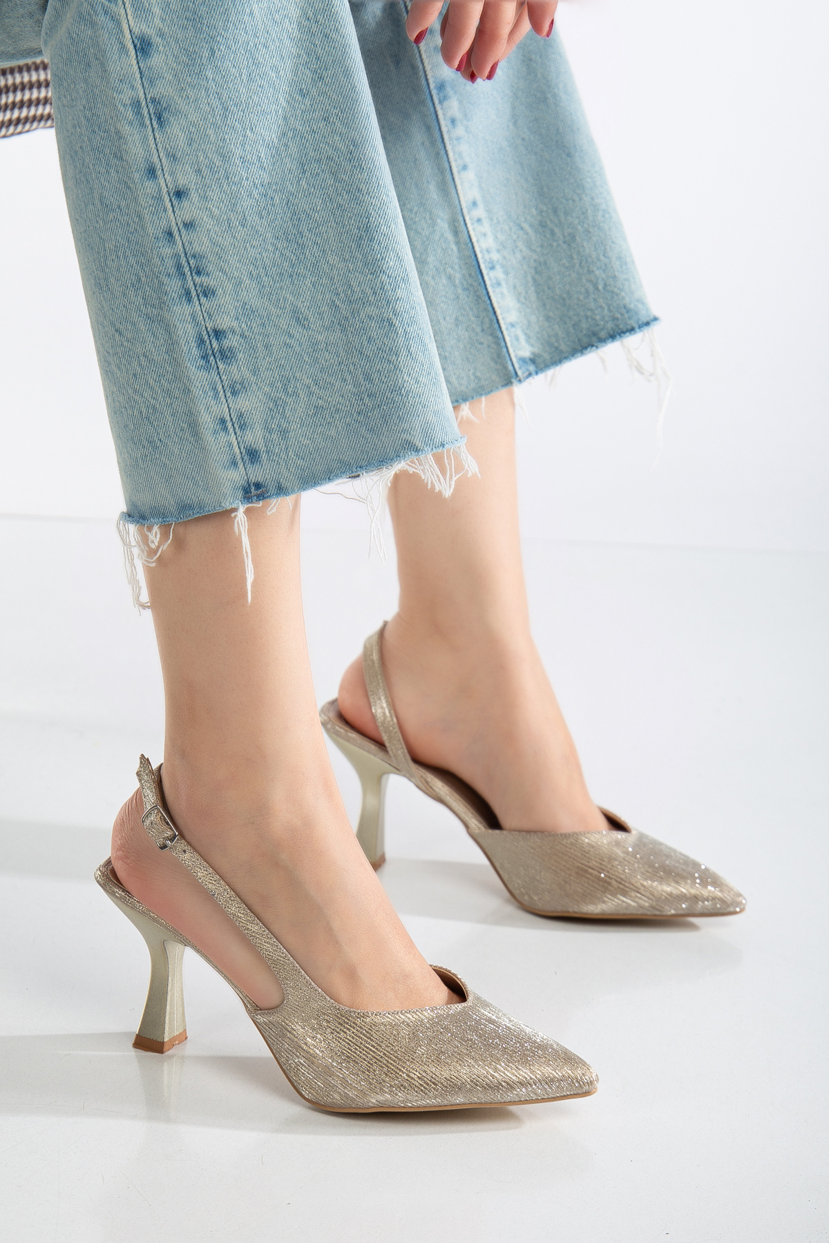 Kadın 9cm Topuklu Düğün Mezuniyet Tokalı Simli Uçlu Sivri Yaz Ayakkabı Altın Işıltılı Modern Şıklık