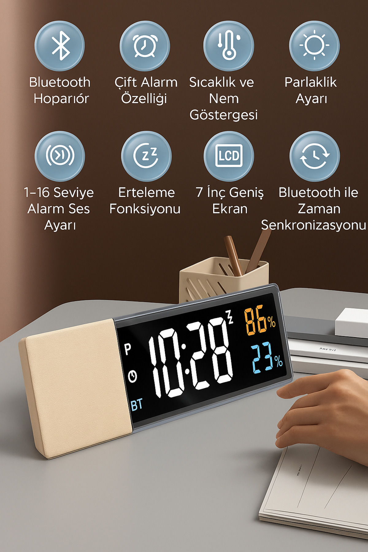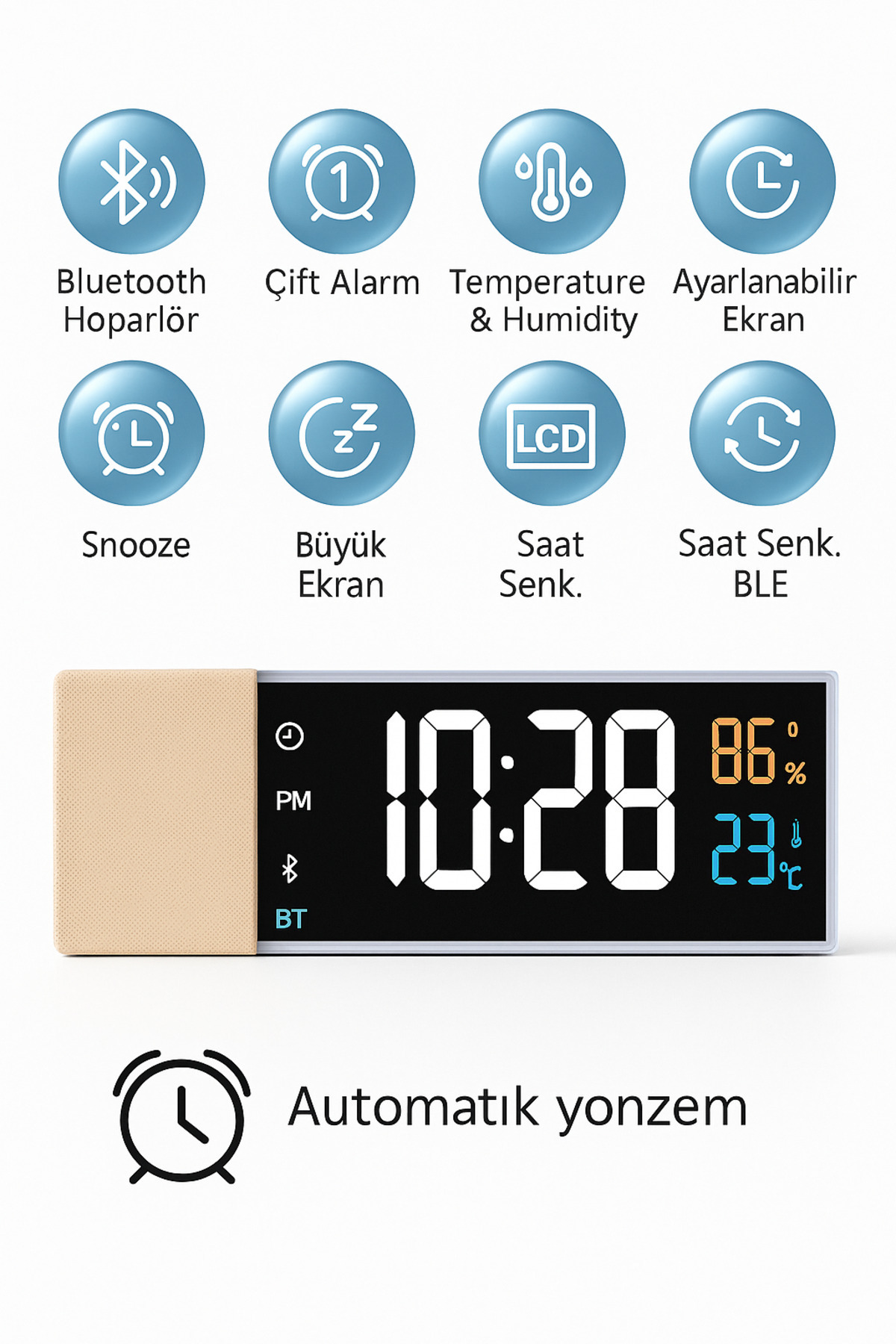 Bluetooth Hoparlörlü Dijital Alarm Saat – 7" LCD, Isı & Nem Ölçer, Çift Alarm