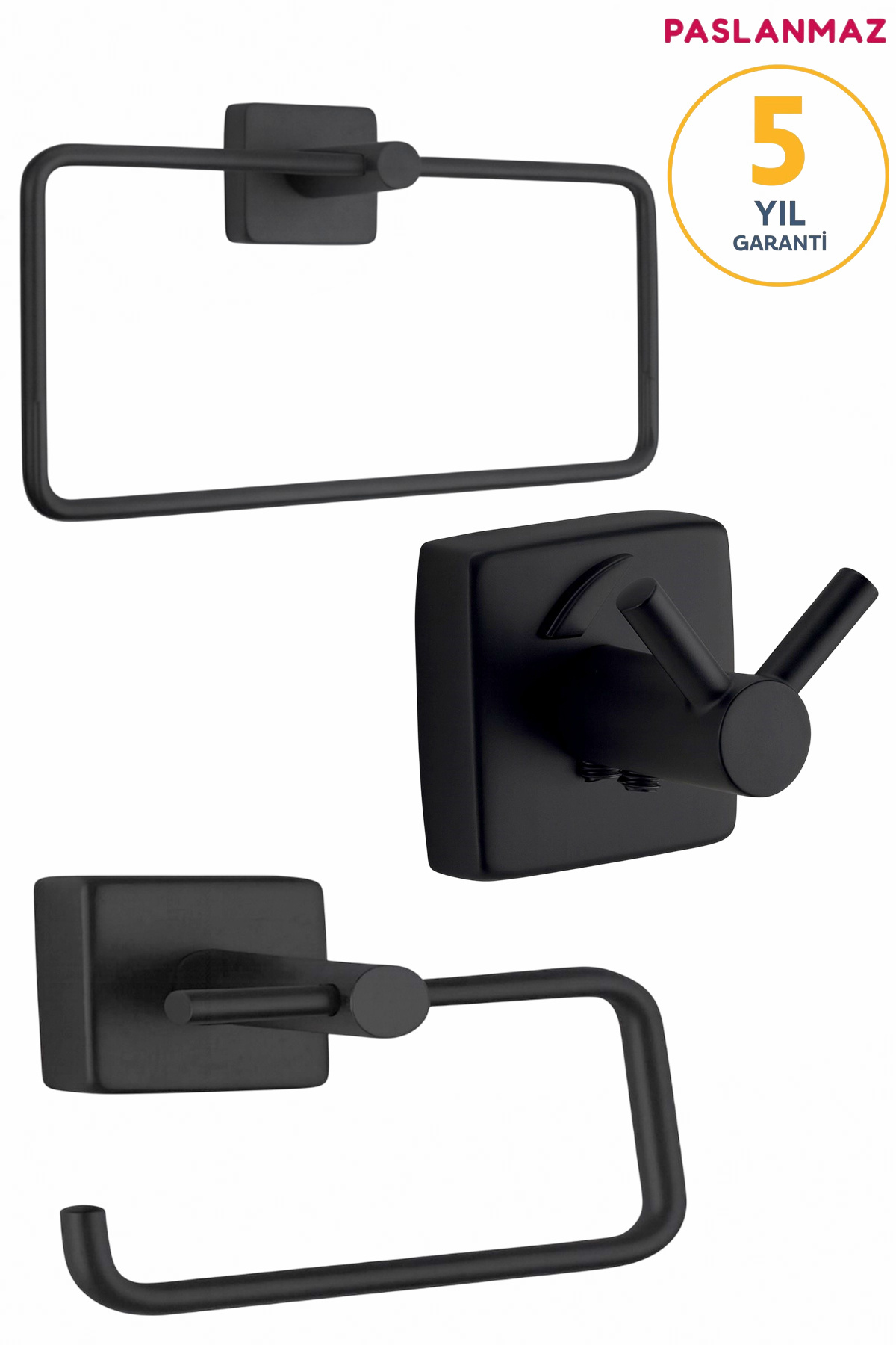 Bu set 3 parçadan oluşur: • Havluluk • Tuvalet kağıtlığı • Askılık Hepsi uyumlu bir tasarıma sahiptir