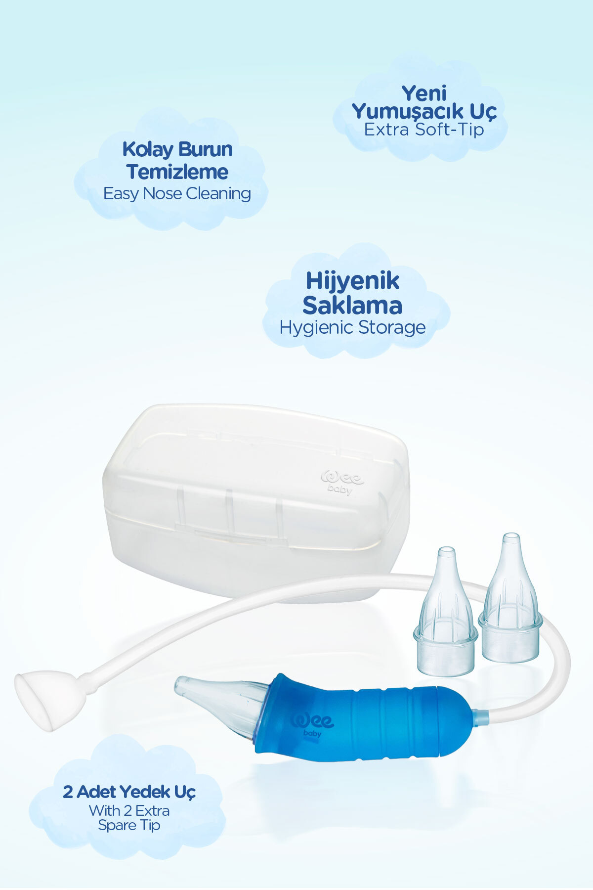 Wee Baby burun aspiratörü, bebeğinizin burnunun doğal yapısına zarar vermeden kolay ve hijyenik bir şekilde temizlenebilmesi için özel olarak tasarlanmıştır.