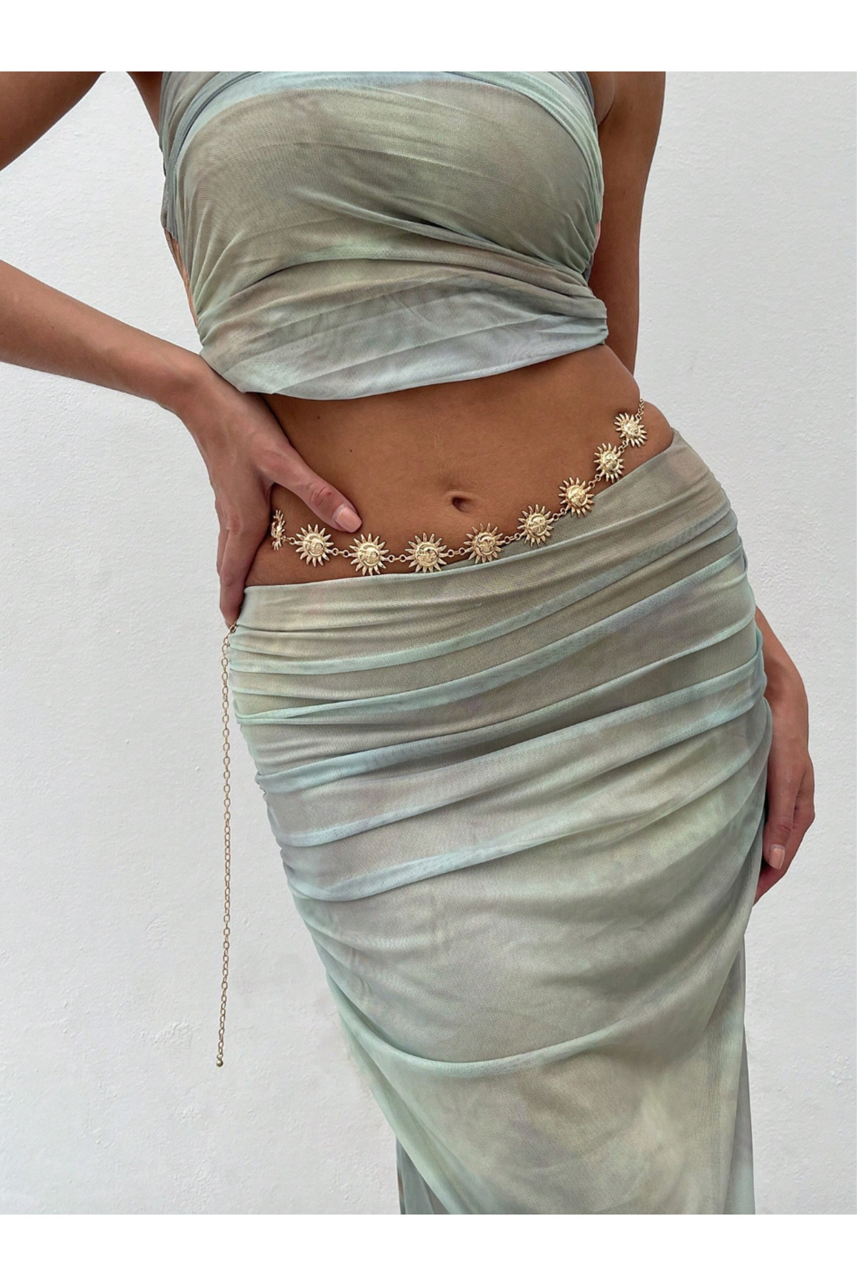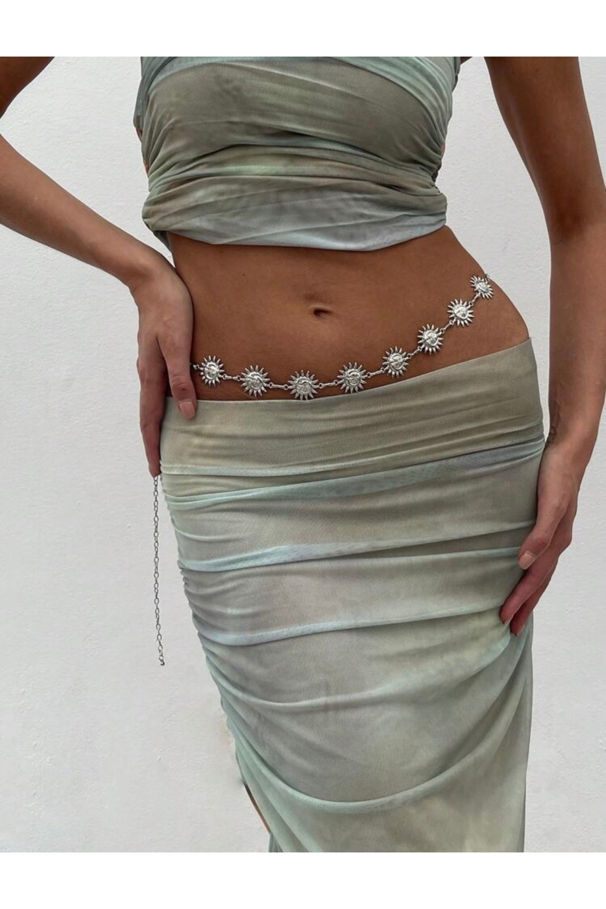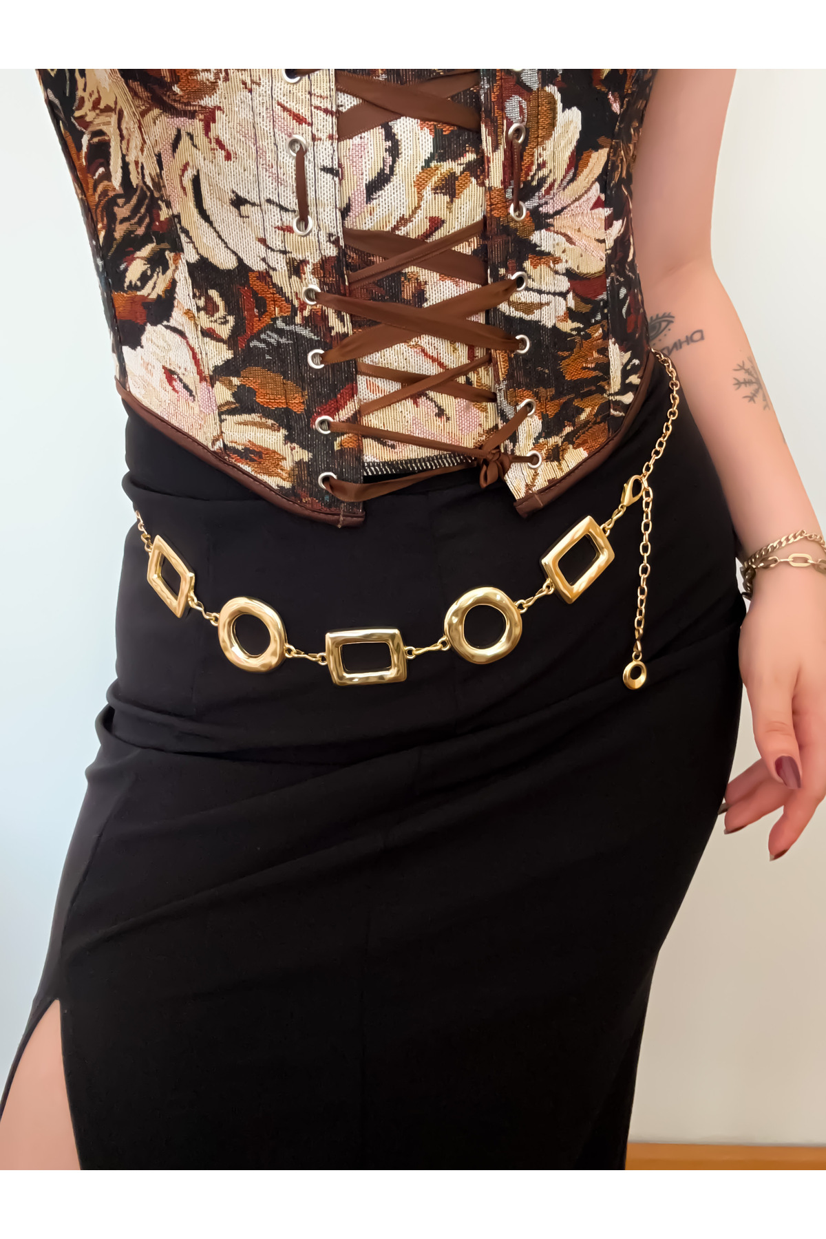 - Güneş detayları ile süslenmiş, şıklığı ve rahatlığı bir arada sunan zincir kemeri, her türlü vücut tipine uyum sağlayacak şekilde tasarlanmıştır.