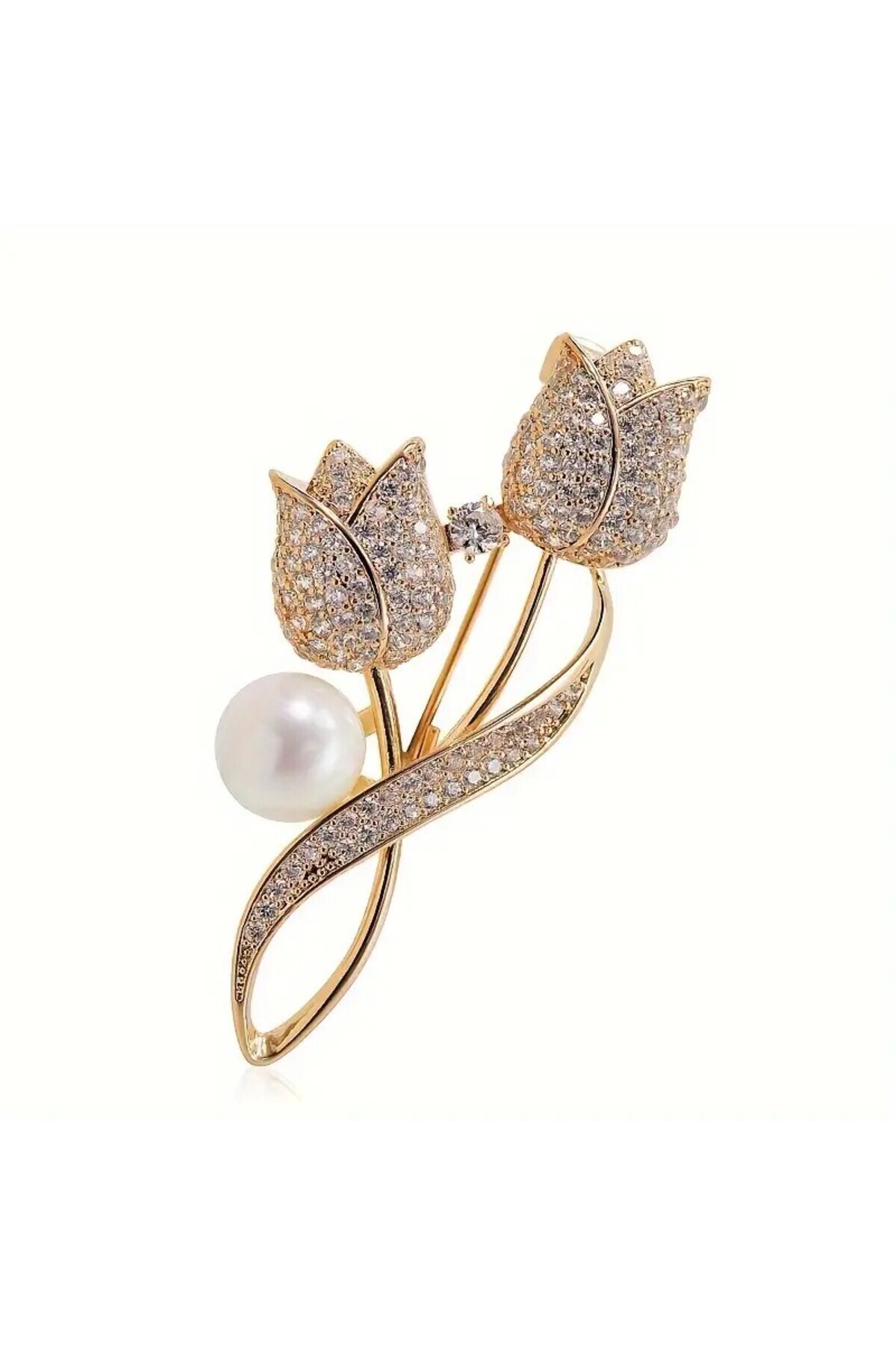 ZİRKON TAŞLI LALE TEMALI İNCİ DETAYLIK KADIN BROŞ