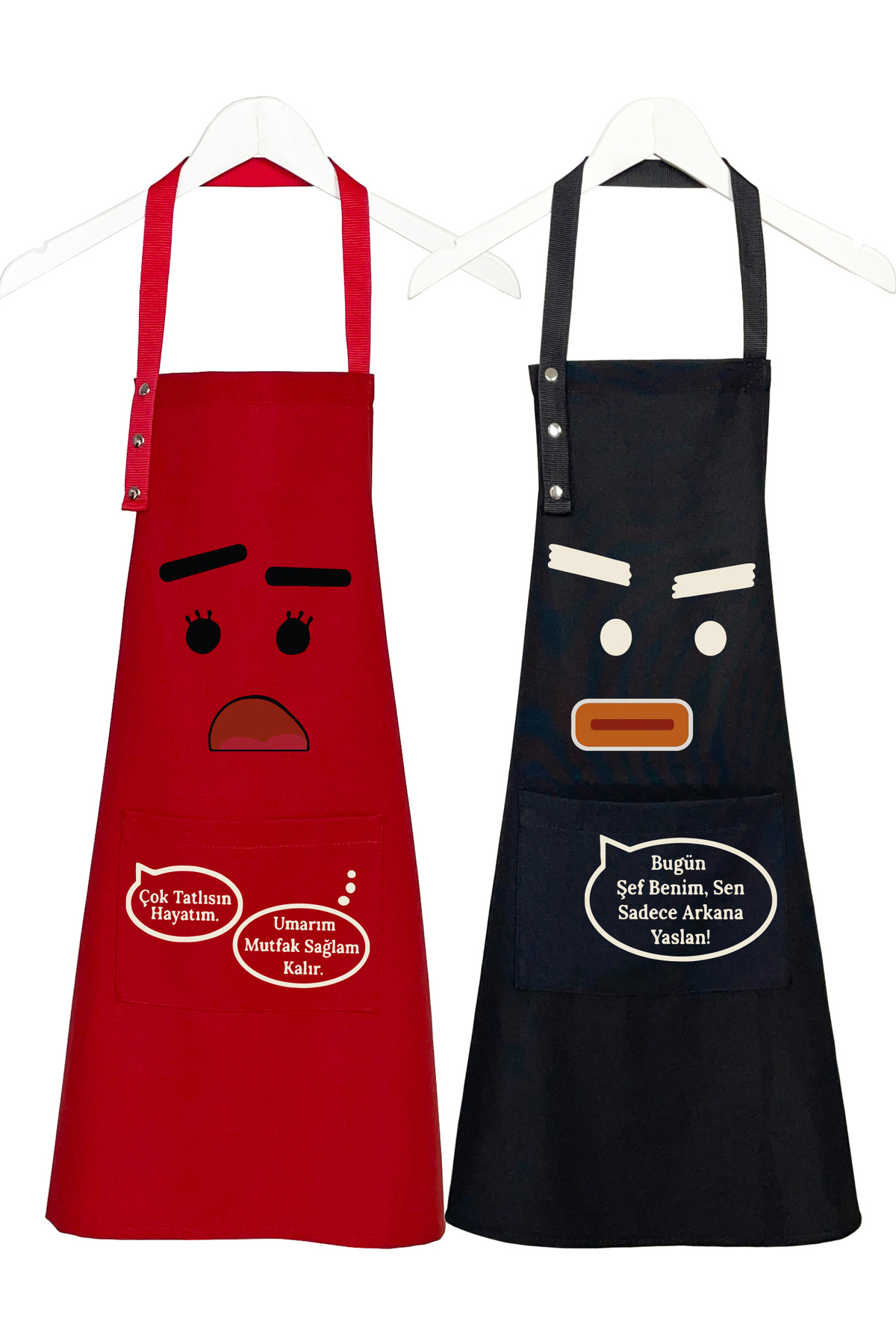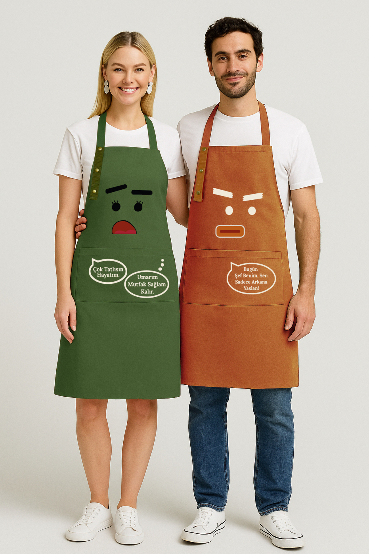 Mutfak Önlüğü Seti 2'li Leke Tutmaz Su Itici Kumaş Solmaz Çeyiz Kadın Erkek Karikatür Esprili Önlük