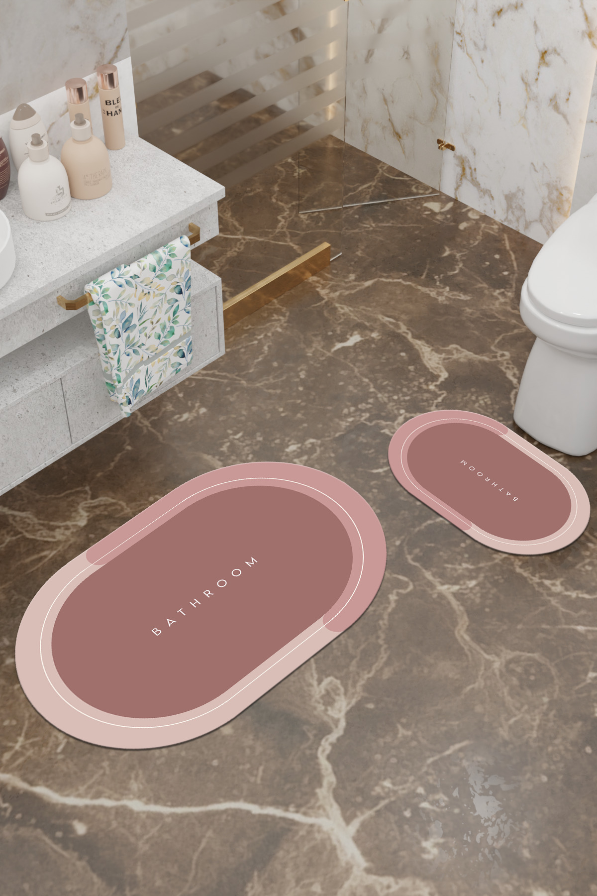 Bathroom Desenli Eko Banyo Paspası, Kaymaz Taban, Makinada Yıkanabilir, Dijital Baskı 2'li Set