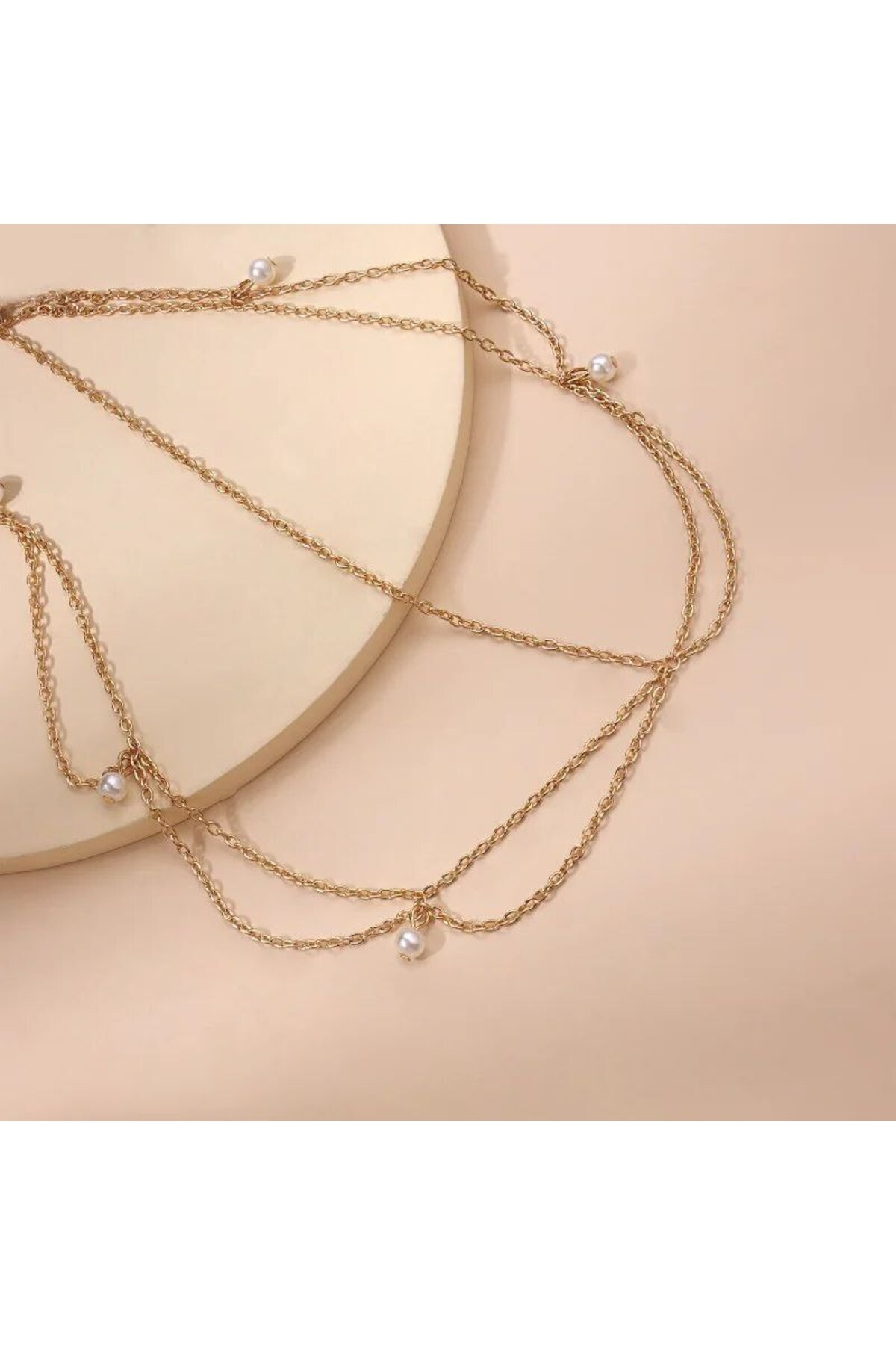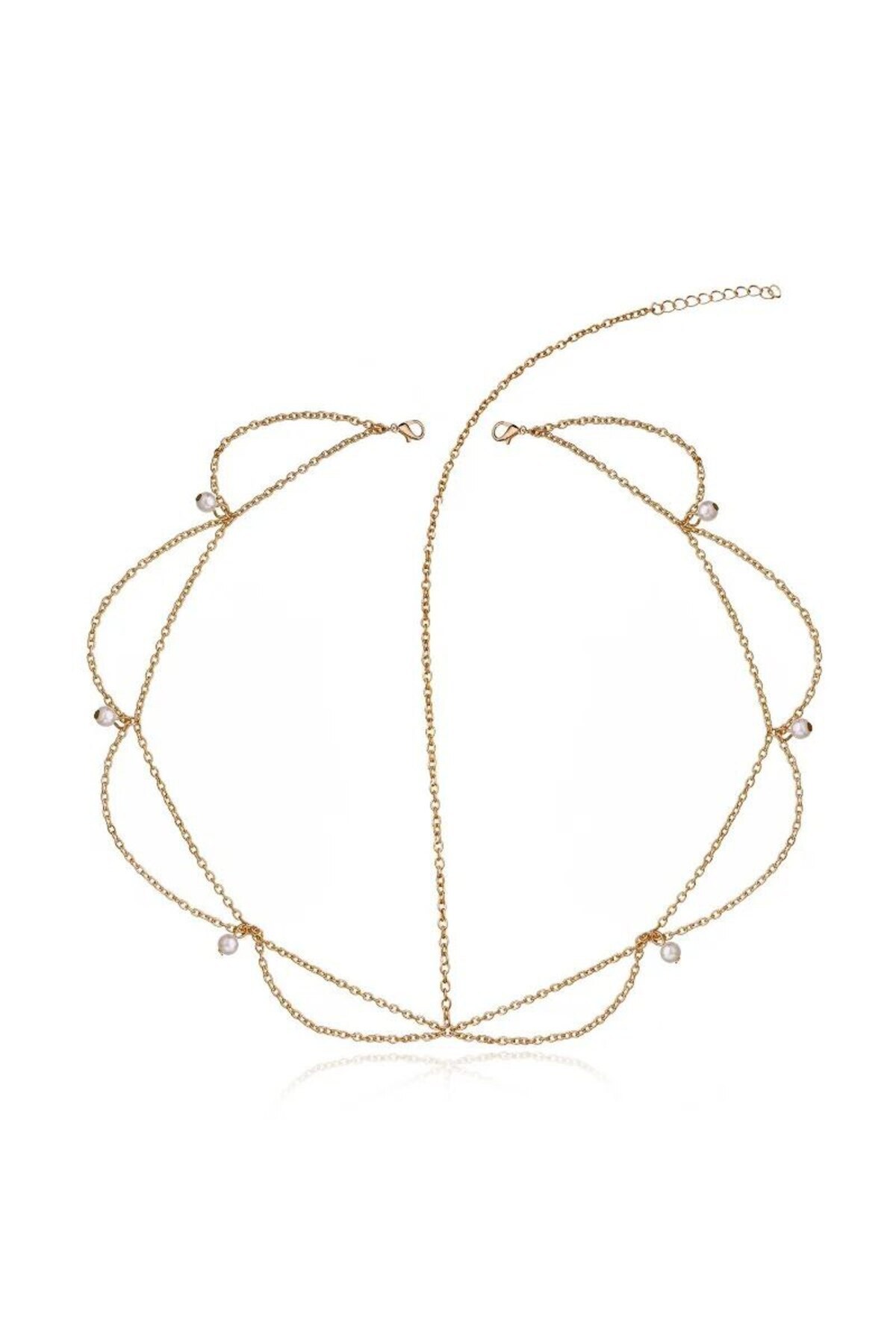 Özel günlerinizde ya da günlük kombinlerinizde şıklığınızı tamamlayacak bu incili zincir kadın kafa aksesuarı, zarif görünümünüzü ön plana çıkarır.