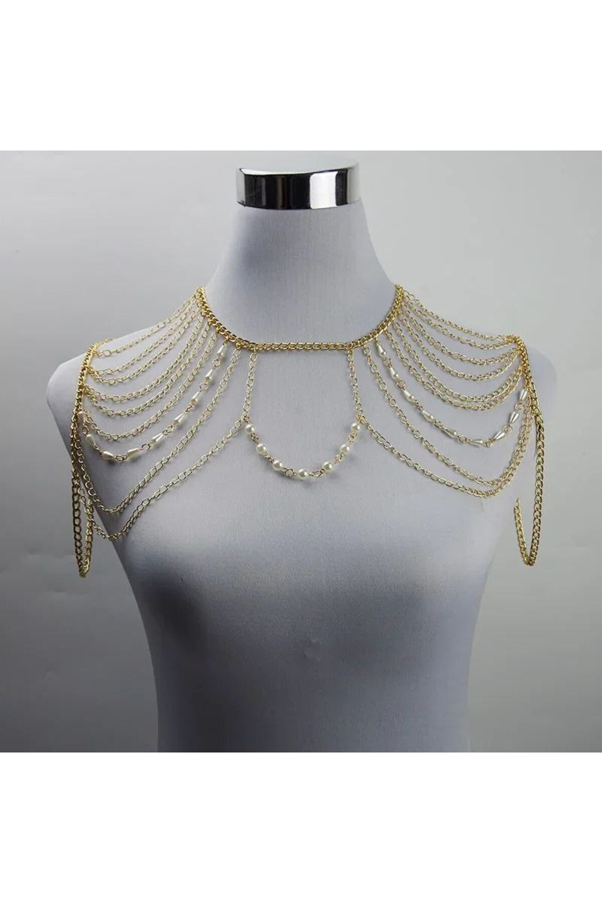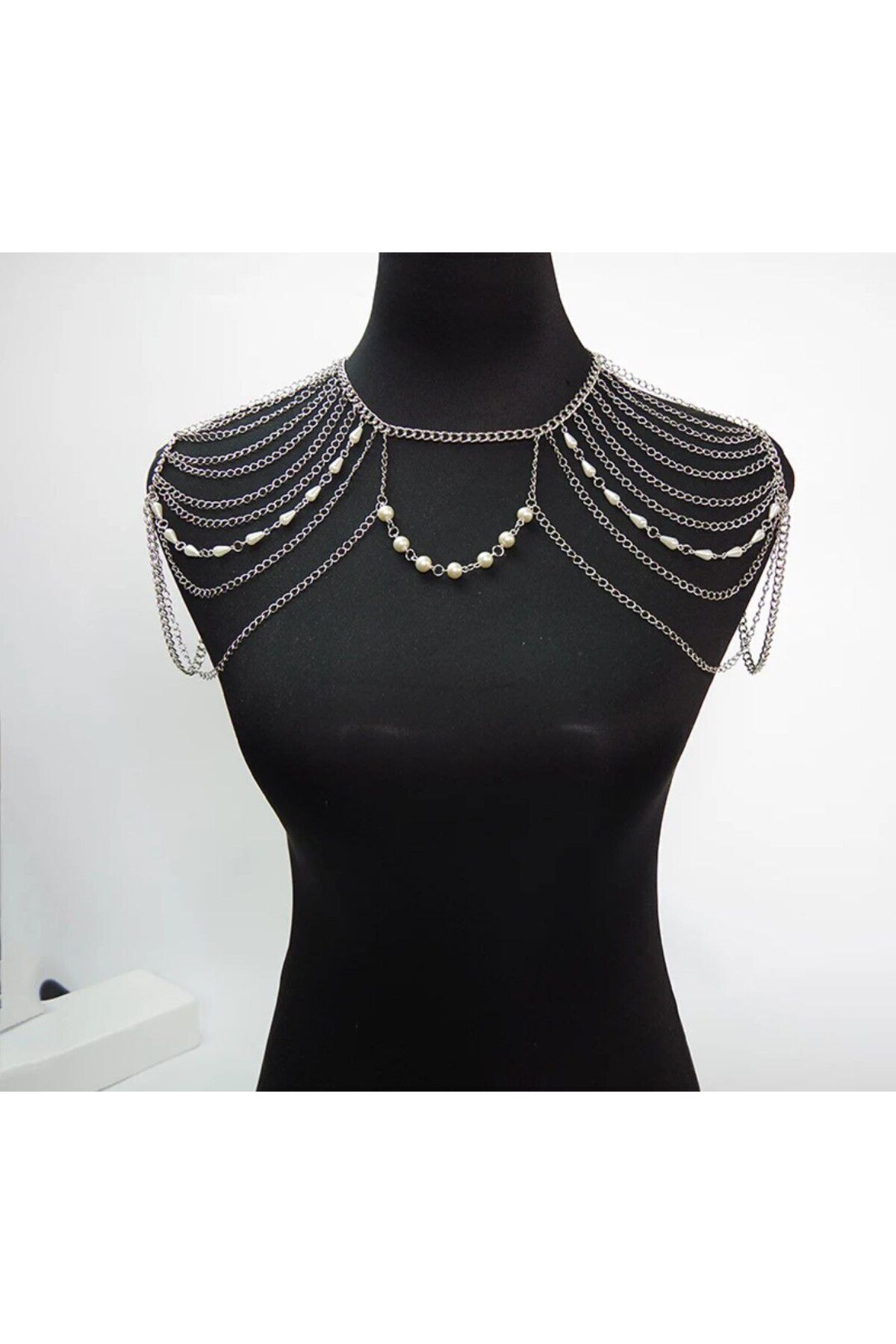 İncili zincir detaylı bu kadın vücut zinciri, zarafetinizi ön plana çıkarırken, her türlü kıyafetle uyum sağlar.