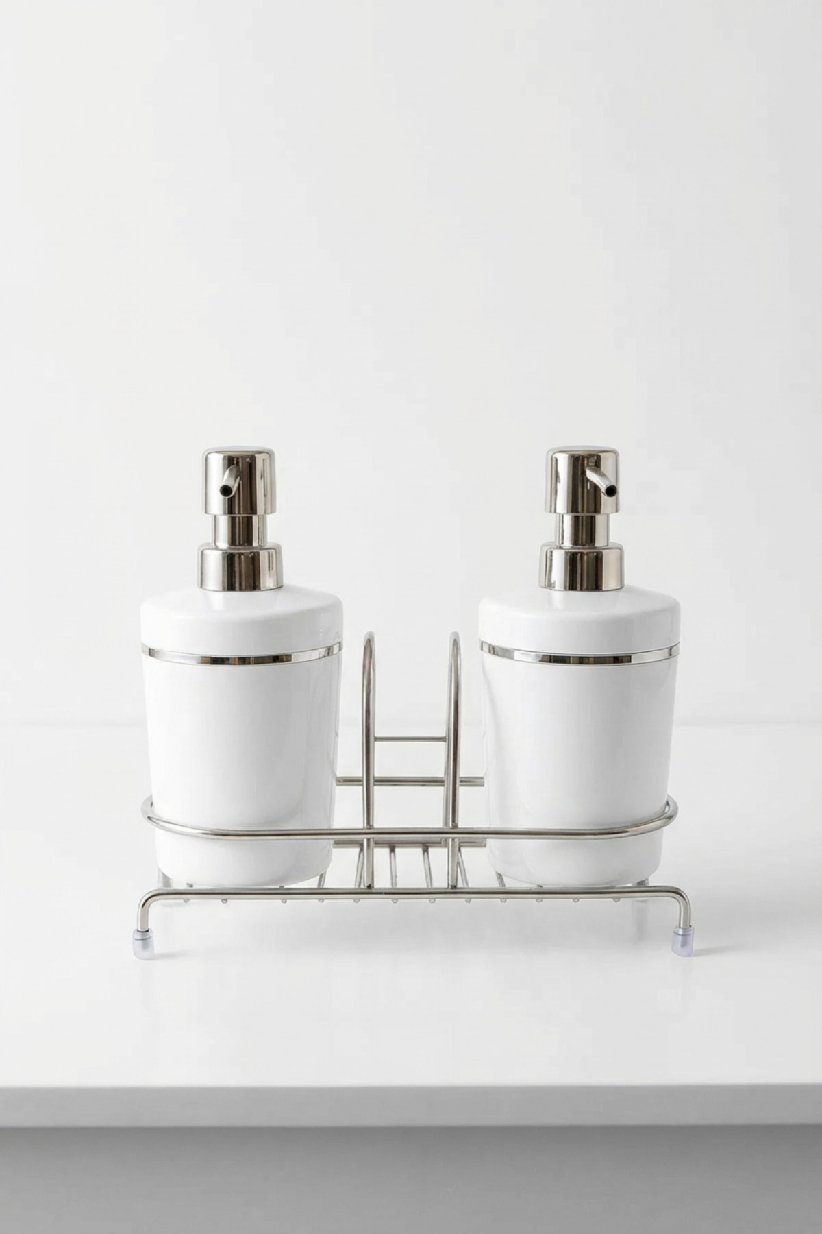 Metal Stantlı Süngerlikli 2’li Akrilik Sıvı Sabunluk / Bulaşık Deterjanlık - Beyaz Şıklık ve işlevsellik bir arada! Mutfak ve banyolarda hem estetik bir görünüm hem de düzen sağlayan bu 2’li sıvı sabunluk seti, paslanmaz metal stant ile tamamlanıyor.