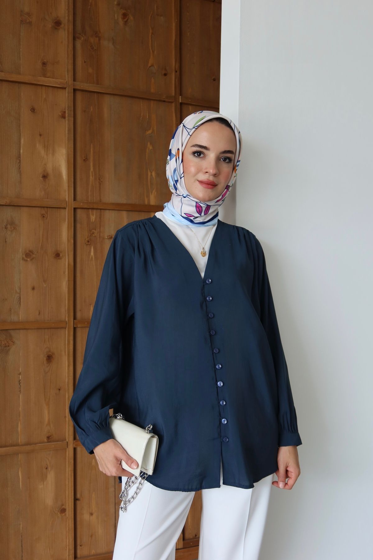 V Yaka Önü Düğme Detaylı Tesettür Gömlek Lacivert