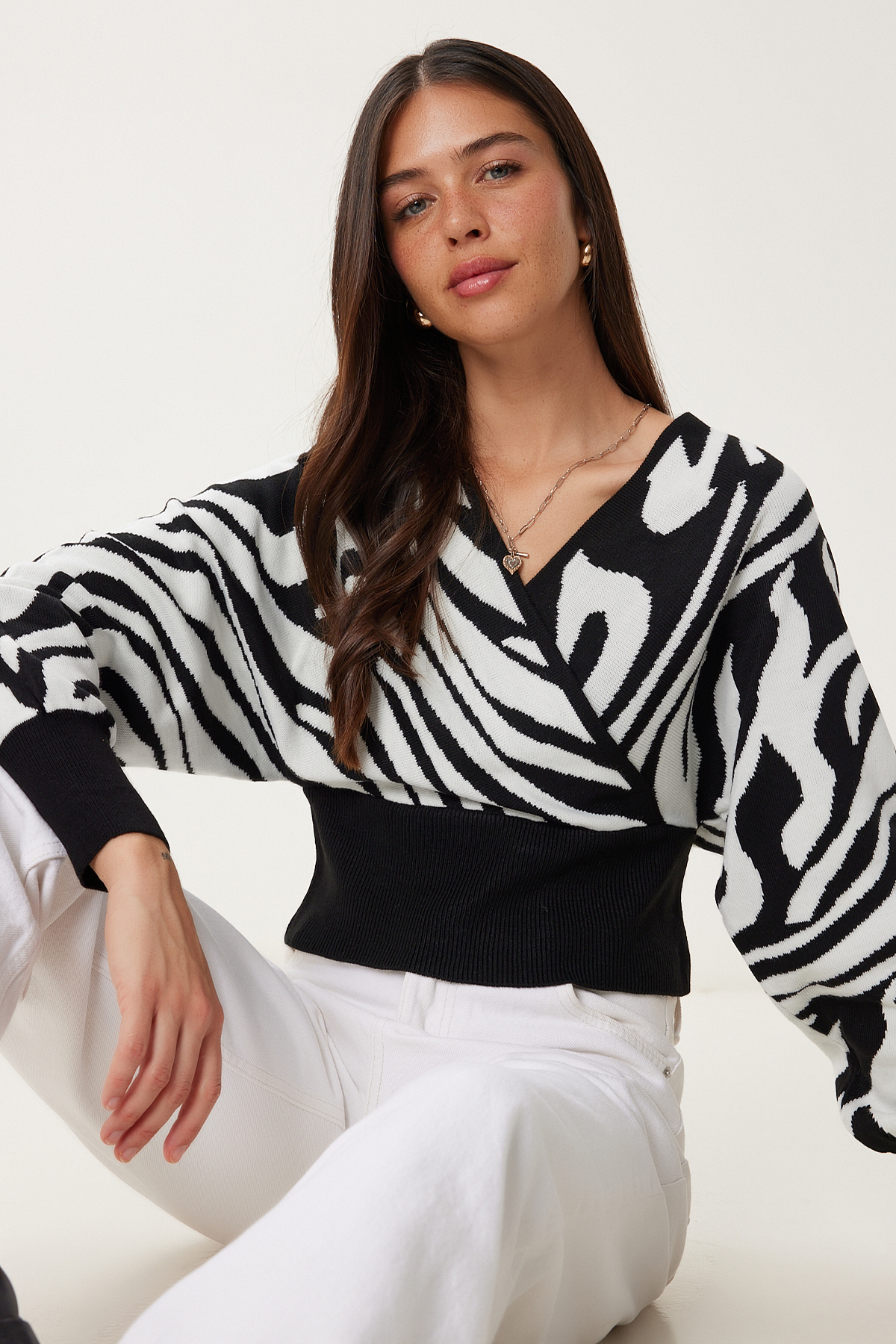 • Kruvaze yaka, esnek yapılı, yarasa kollu, desenli, crop triko kazak