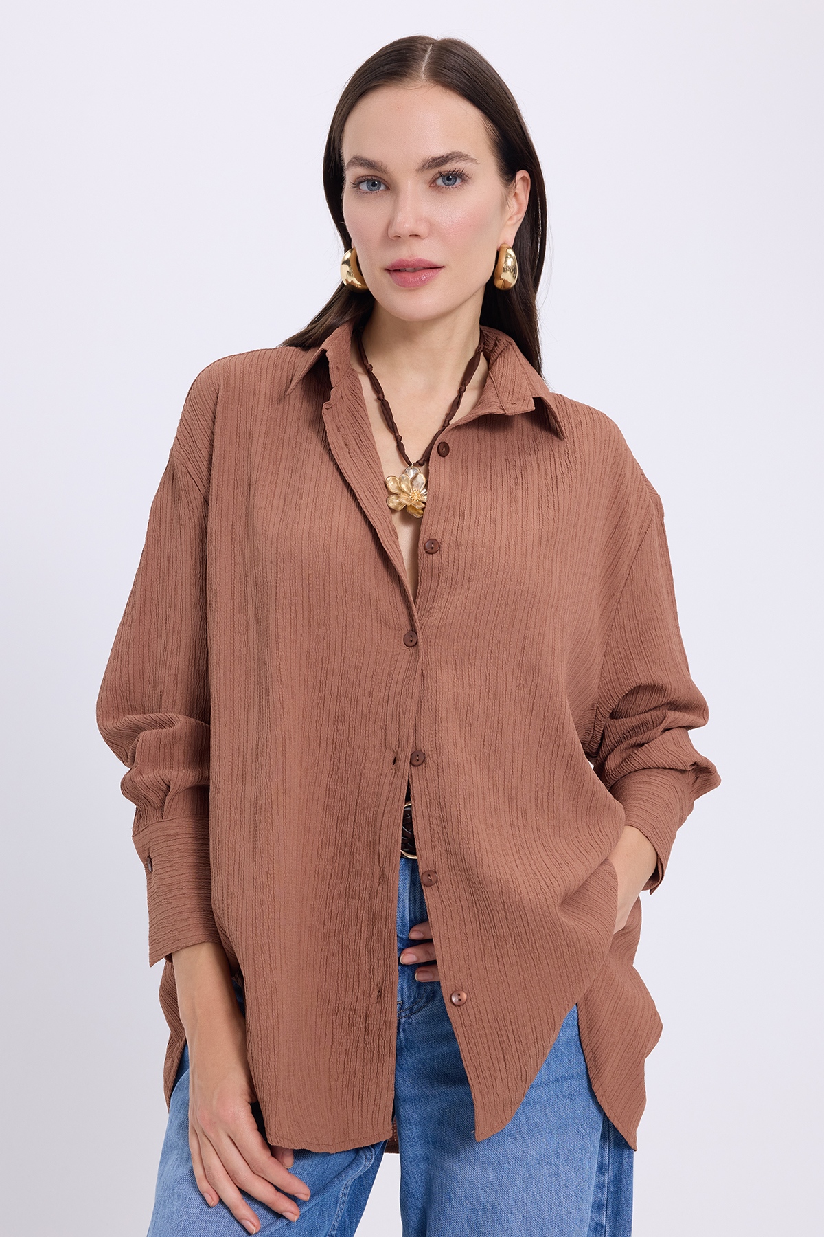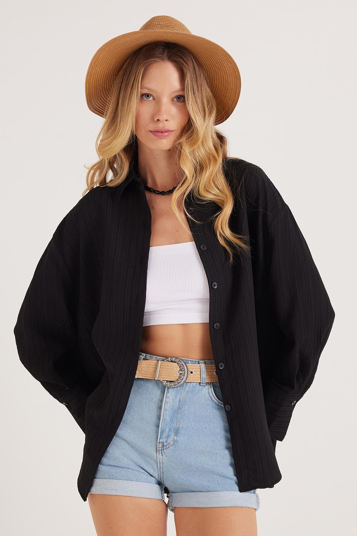 Kadın Oversize Geniş Kesim Bürümcük Pens Detaylı Uzun Kollu Dokulu Siyah Gömlek