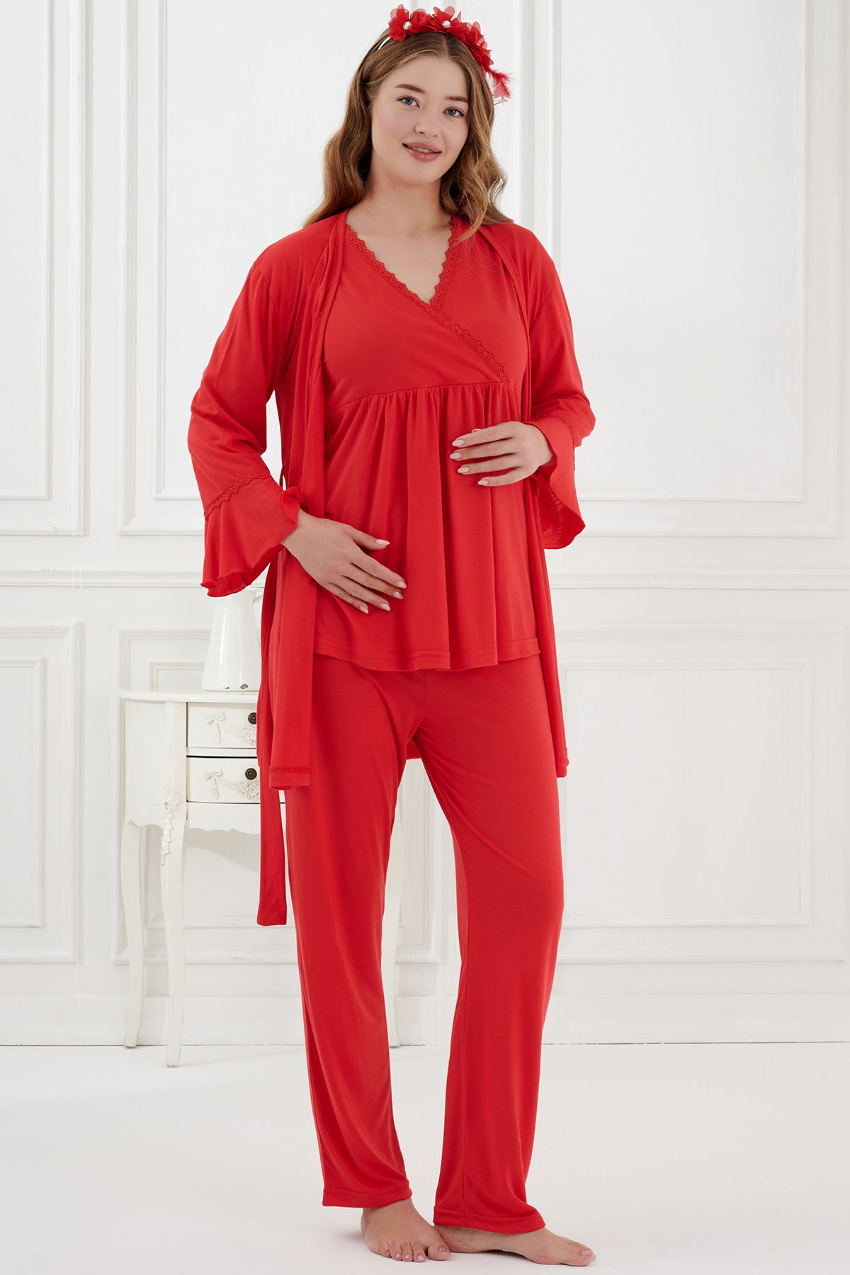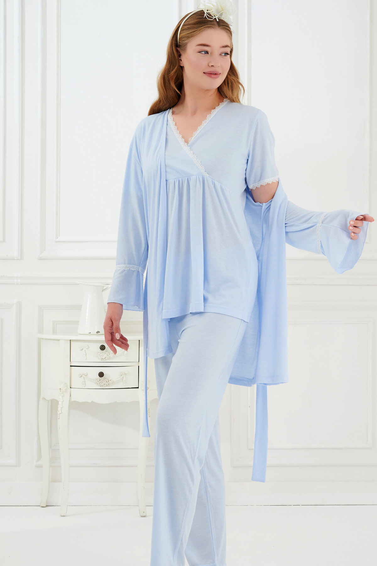 Dantelli Sabahlıklı 3'Lü Lohusa Hamile Pijama Takımı