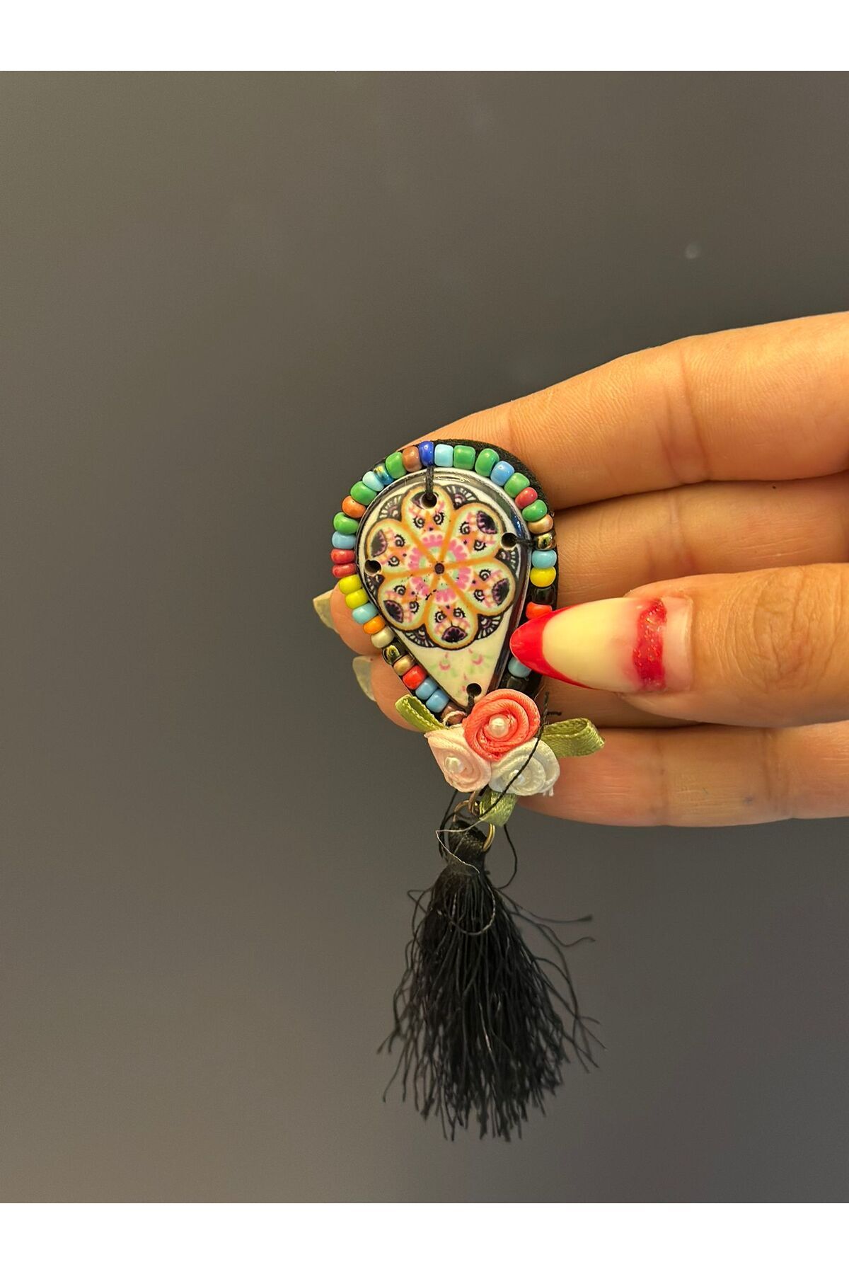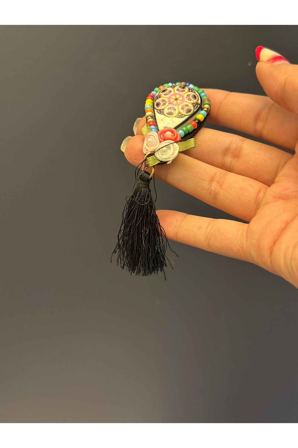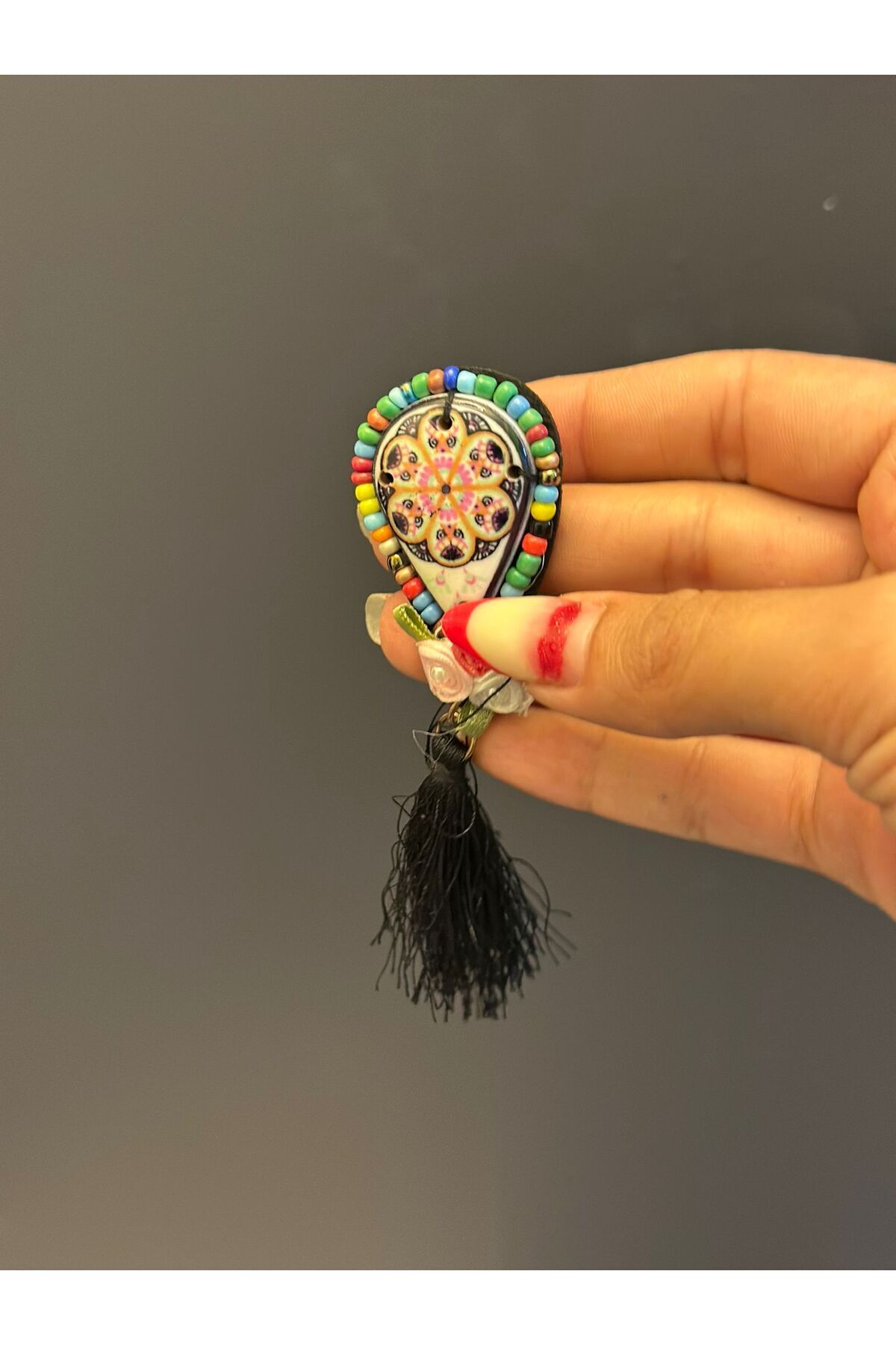 - Etnik desenleriyle dikkat çeken püsküllü broş, şıklığınızı tamamlar.