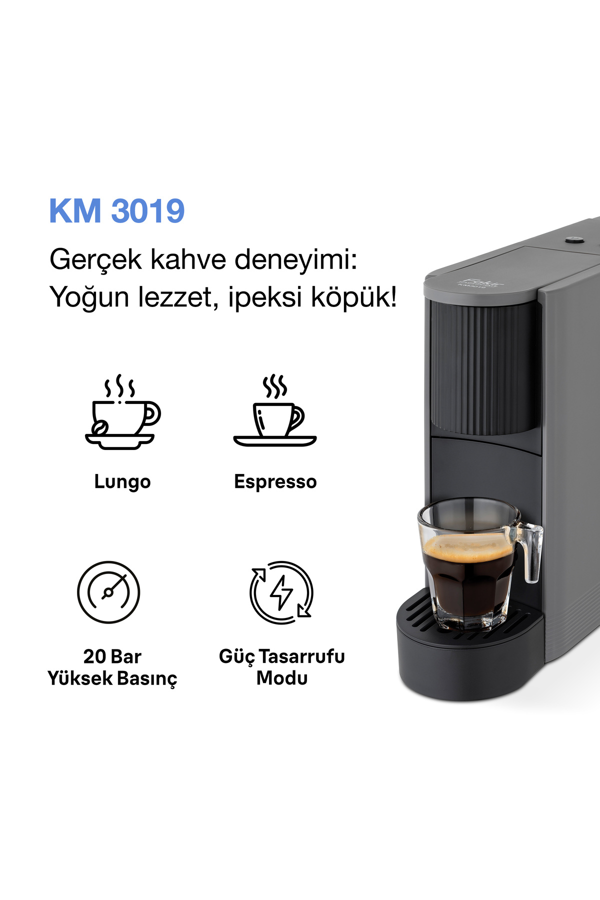 Fakir KM 3019 Kapsül Kahve Makinesi, 20 bar yüksek basınç gücüyle her fincanda barista kalitesinde espresso ve lungo sunar. Tek dokunuşla çalışan sistemi, hızlı ısınma ve ayarlanabilir kahve miktarıyla kişiselleştirilmiş lezzet sağlar. 6 kapsüllük atık haznesi, kireç önleyici sistemi ve güç tasarrufu modu ile pratik ve sürdürülebilir bir kullanım sunar. Yoğun aroma ve ipeksi köpükle gerçek kahve deneyimini evinize taşır.