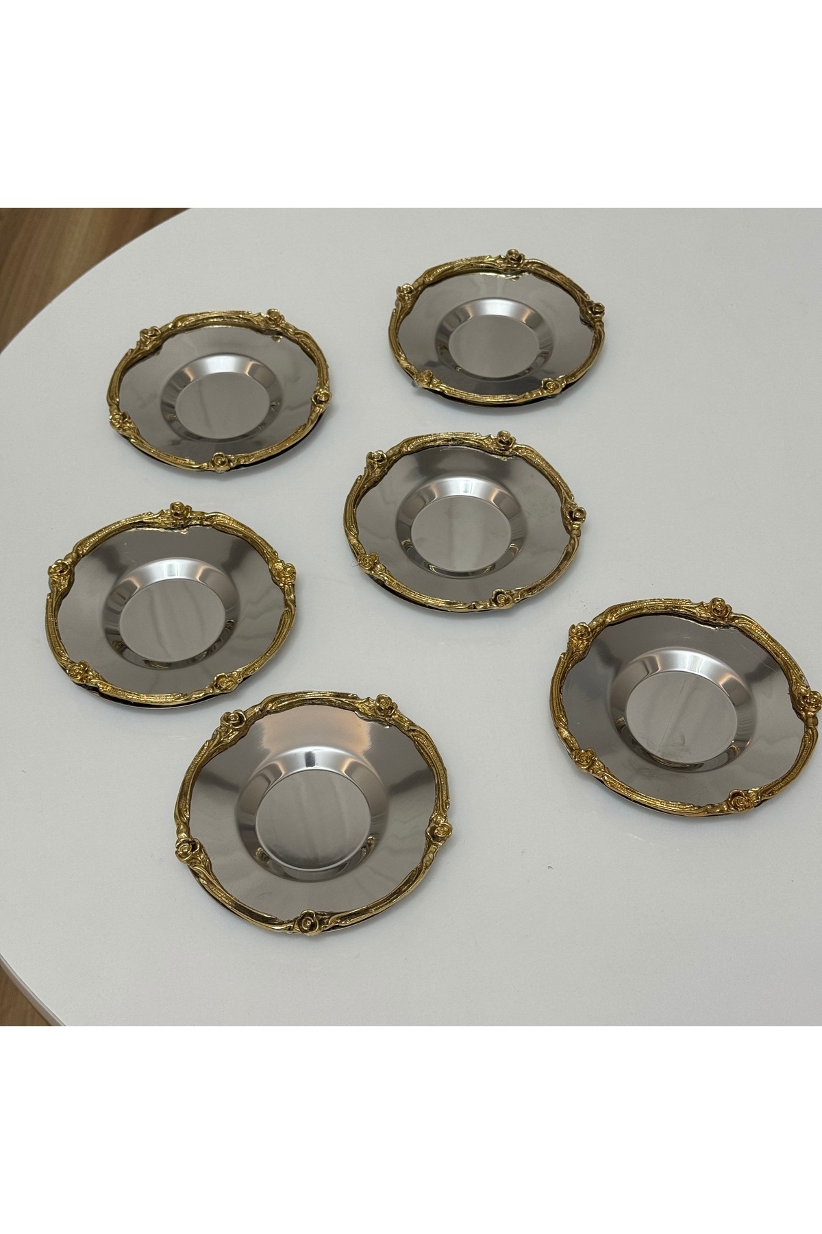 Paslanmaz çelik gümüş renk gold gül çerçeveli bardak altlığı çay tabağı 6 adet olarak gönderim sağlanmaktadır