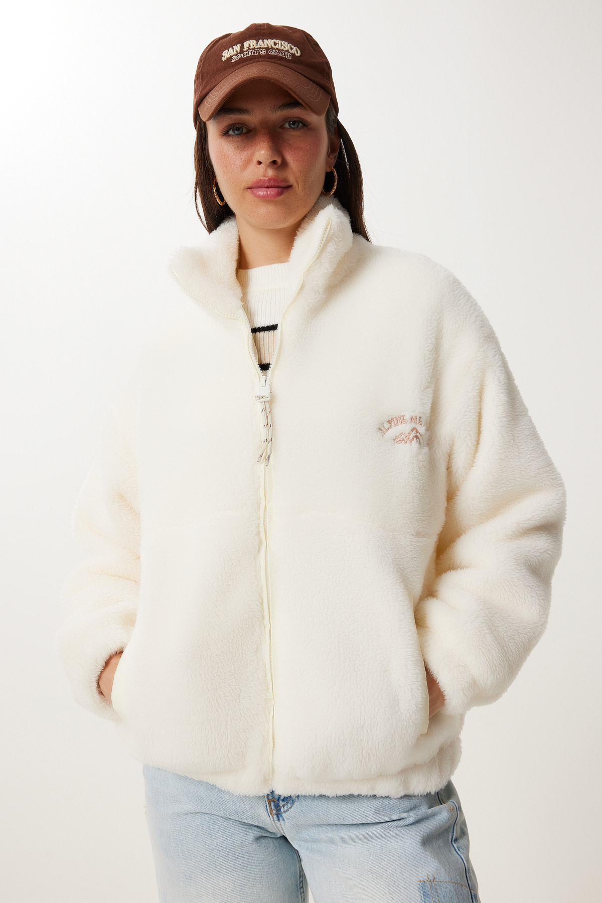 Dik yaka, fermuar kapamalı, astarlı, yan cepli, nakış işlemeli peluş mont