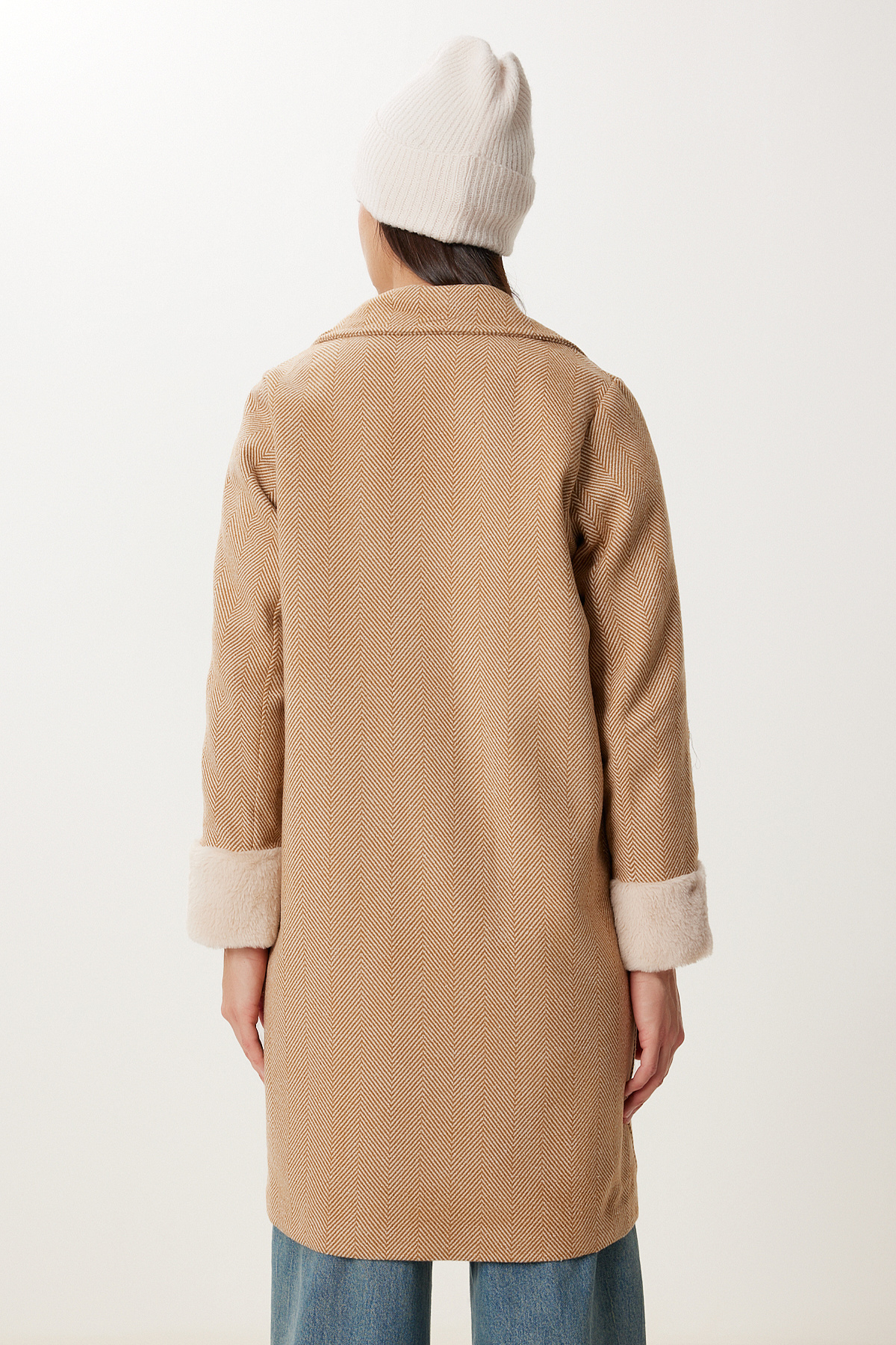 Kruvaze yaka, düğme kapamalı, astarlı, ön cepli, kol ucu kürklü kaşe kaban