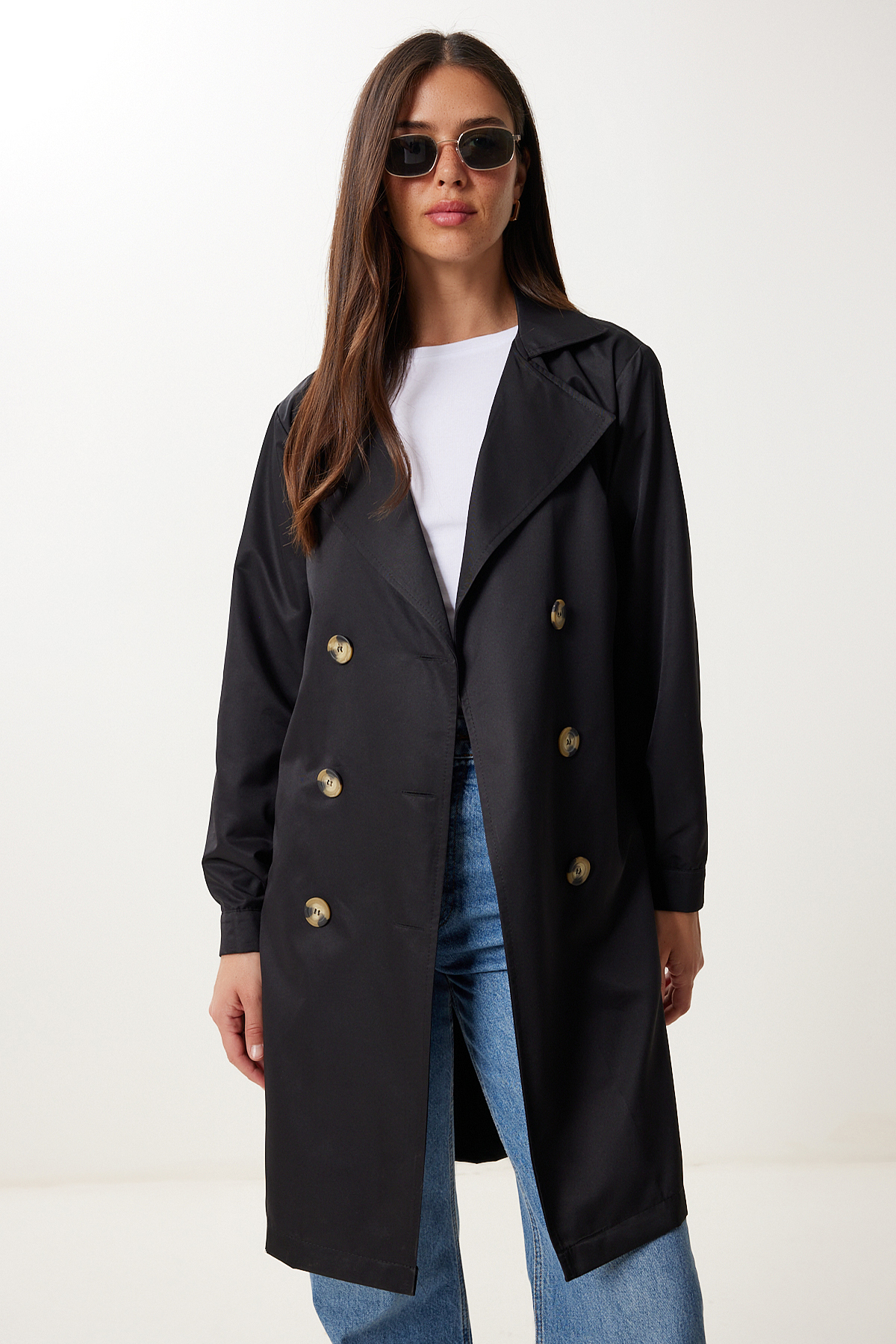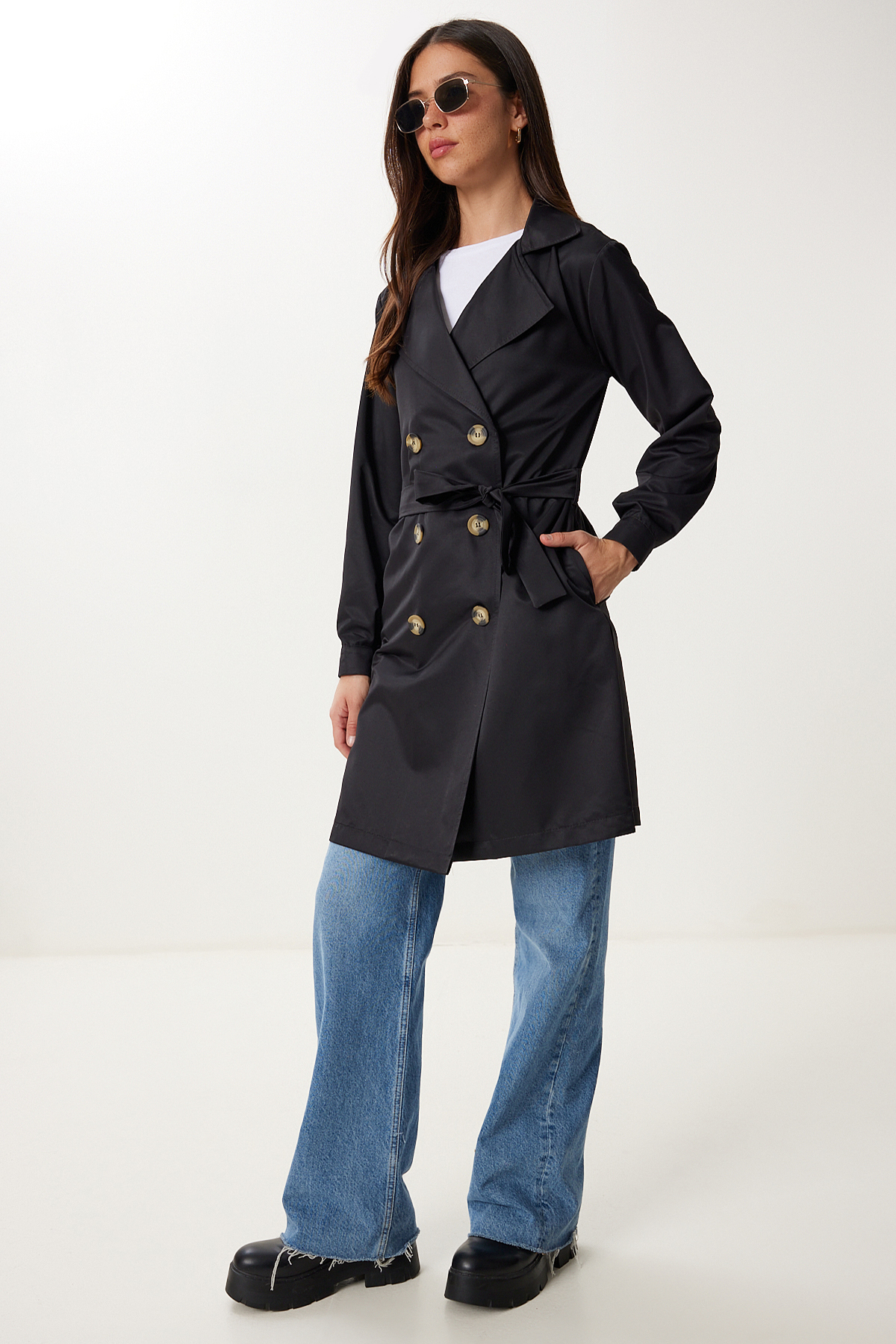 Kadın Siyah Kruvaze Yaka Kuşaklı Mevsimlik Trençkot DD01374